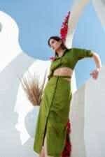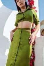 This set includes a moss green open-slit skirt and fitted top. Suitable for casual outings or brunch.