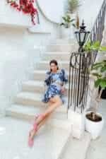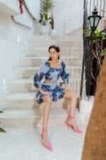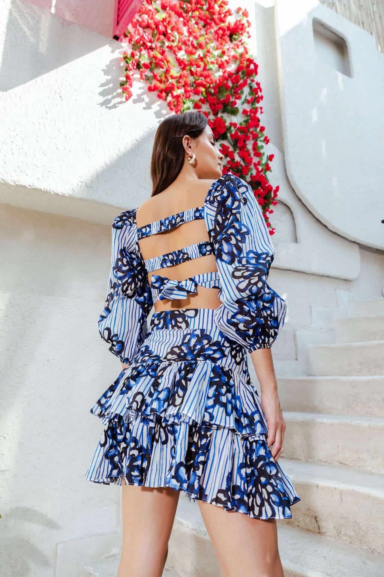 Two-piece set featuring hand-printed azure blue florals. Includes a top with back detailing and a frill skirt.