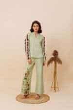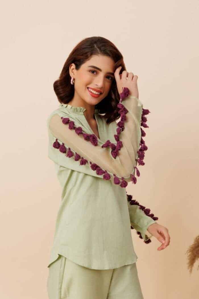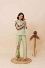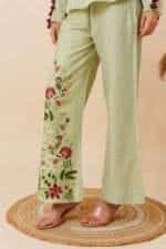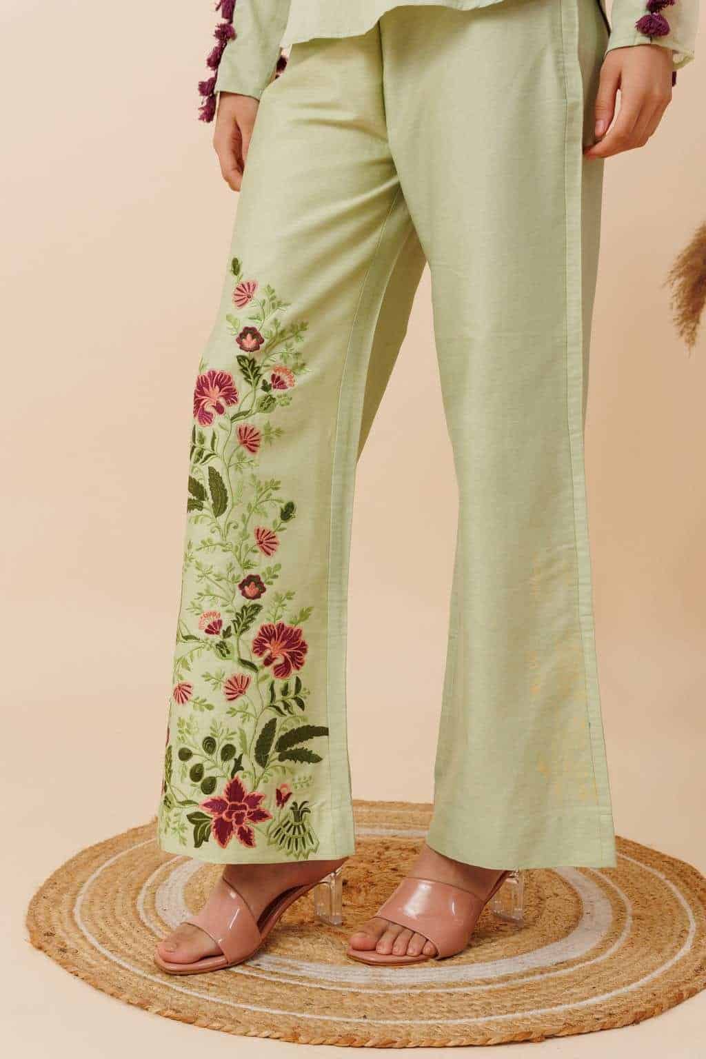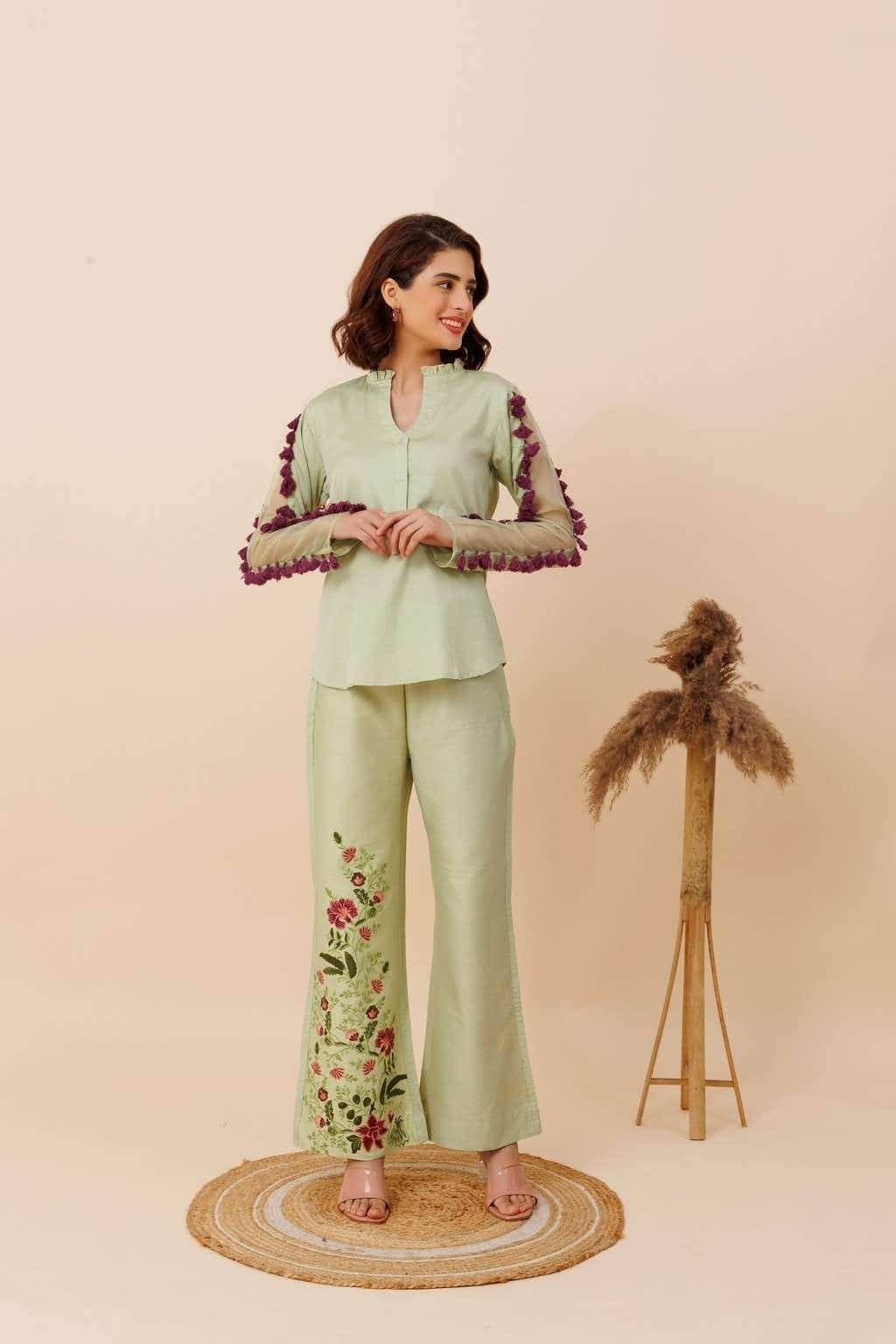 Bell-bottom co-ord set with embroidered detail on one leg. Organza sleeves with jhallar lace. Made from breathable cotton fabric with tailored fit.