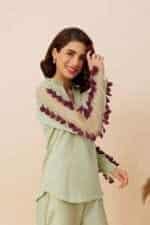 Turn heads effortlessly in our bell-bottom embroidered co-ord set! Featuring elegant organza sleeves with jhallar lace and eye-catching embroidery down one leg, this breathable cotton outfit combines timeless elegance with lively flair. Designed for comfort and a perfect fit, it’s your new go-to ensemble.