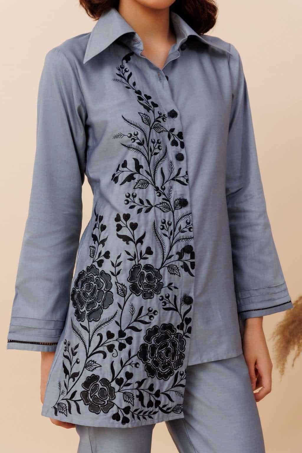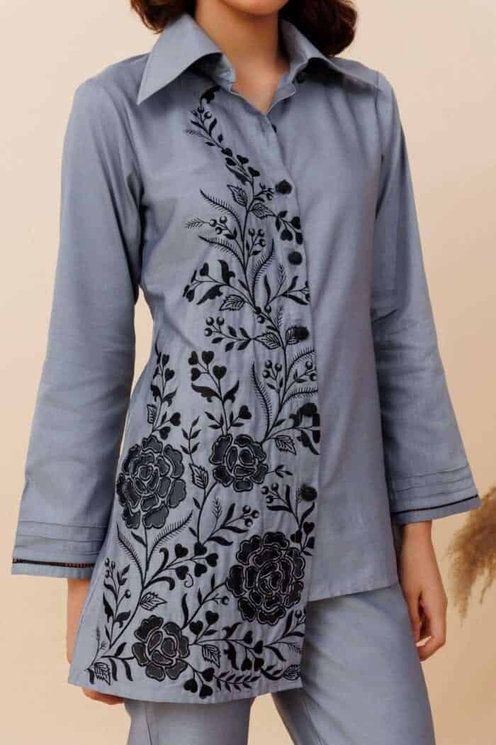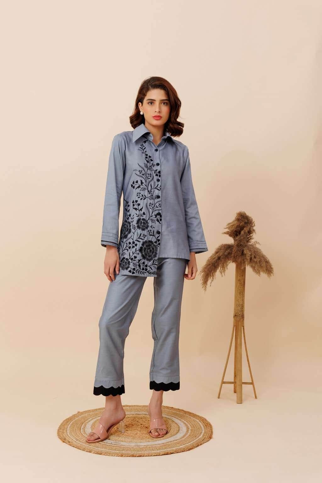 The Classic Co-ord Set features intricate embroidery and an organza flower design. Made from a soft cotton blend fabric, it offers comfort and style, making it suitable for formal events and gatherings.