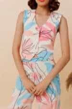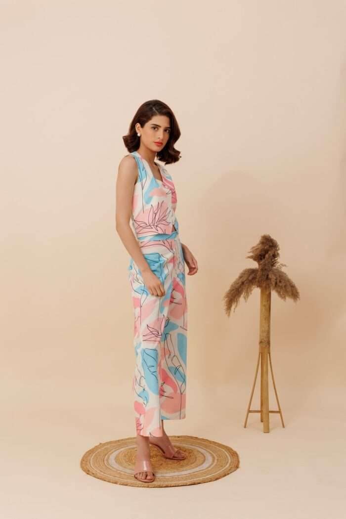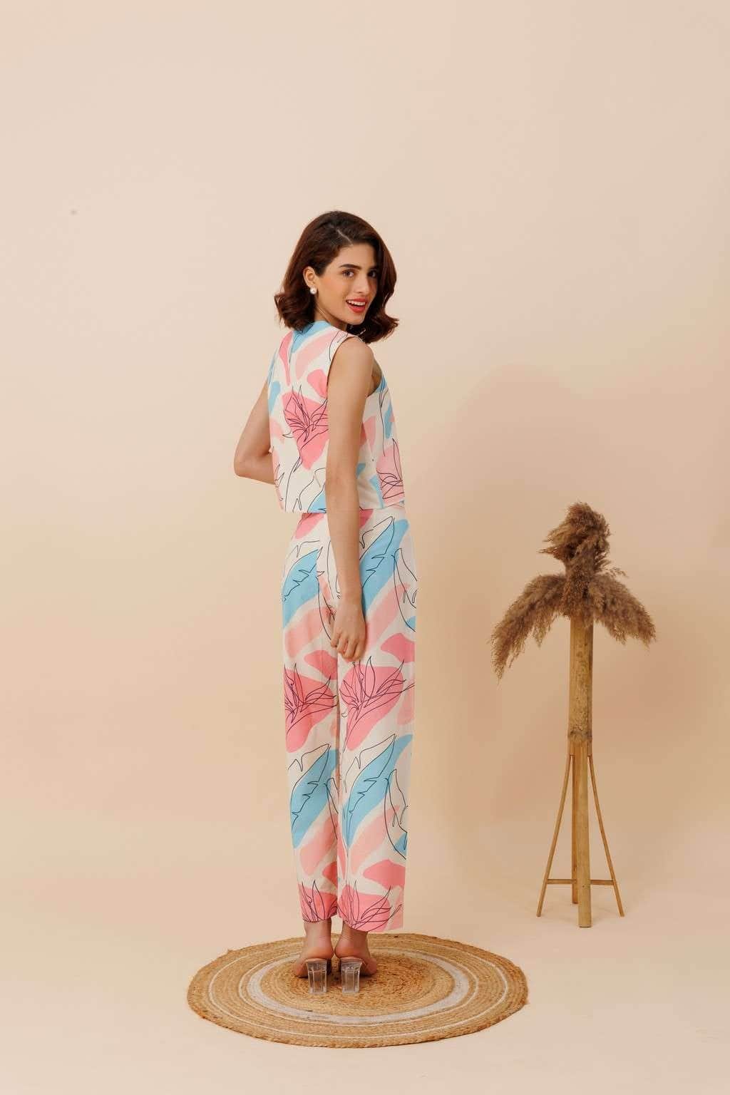 V-neck waistcoat with bright abstract print, asymmetric hem, and front button closure. High-waist, wide-leg trousers in matching printed cotton, featuring an adjustable waistband with drawstrings.