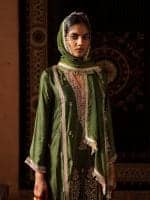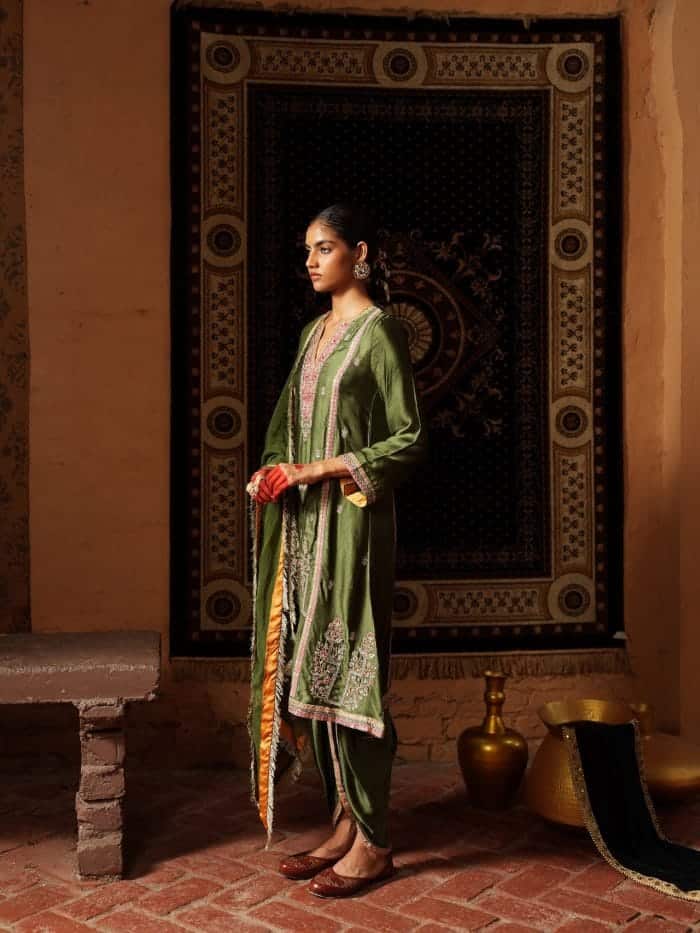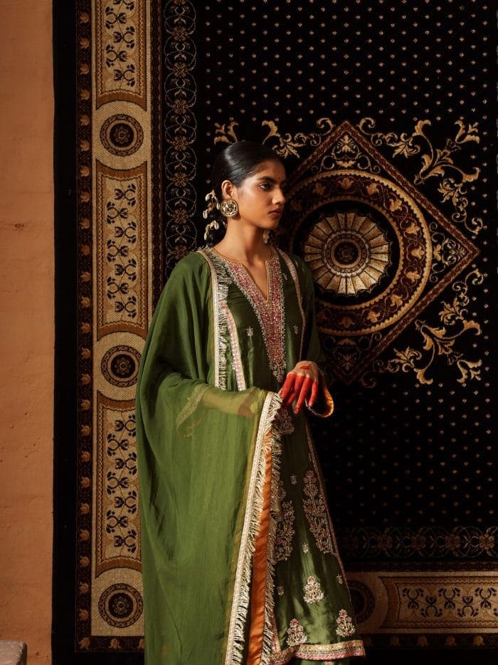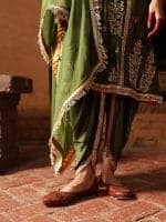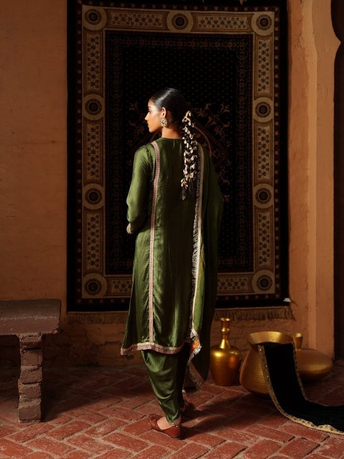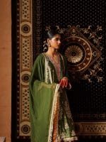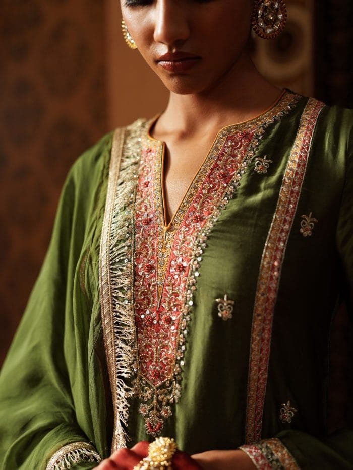 Make a statement in this stunning olive green ensemble, where rich gold embroidery meets elegant design. The luxurious kurta features intricate floral and paisley patterns, accented with delicate coral pink details for a fresh, feminine touch. Paired with matching dhoti trousers and an embroidered dupatta, this outfit is perfect for weddings, festive events, and special celebrations that call for timeless style.