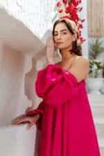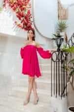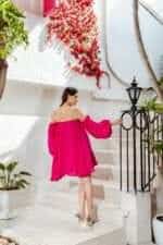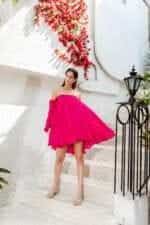 The Peony Bubble Dress features a vibrant solid color and an off-shoulder design. Pair it with heels or flats for a versatile party look.