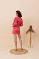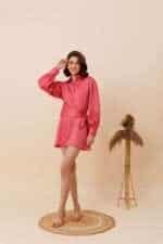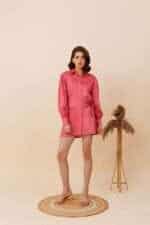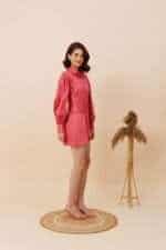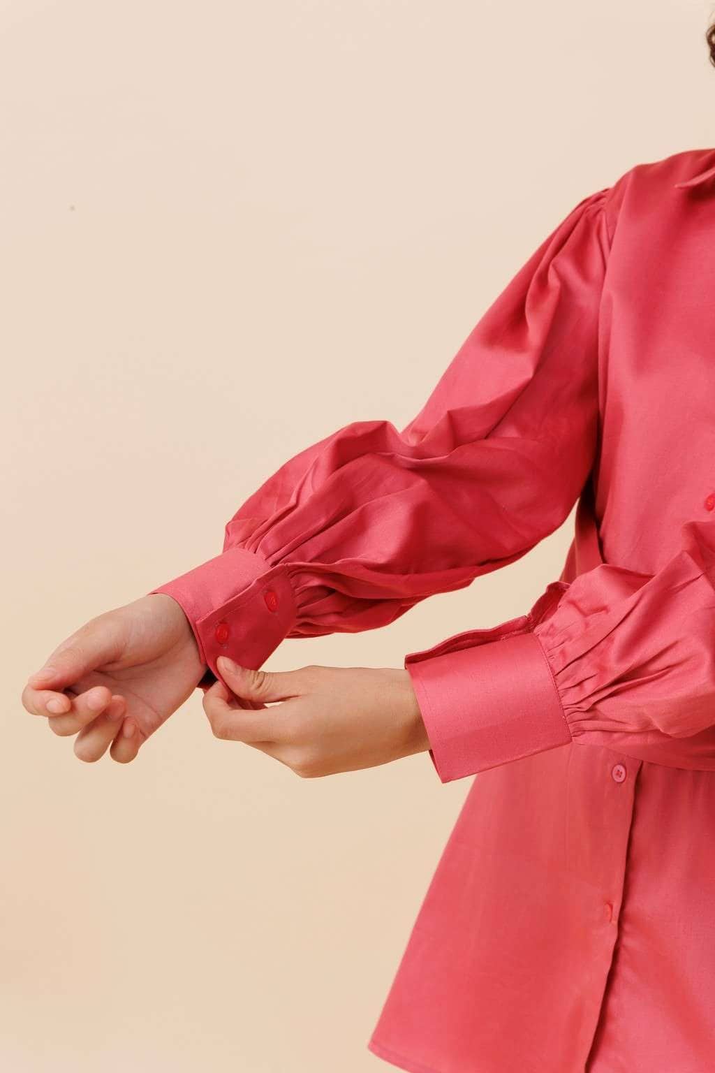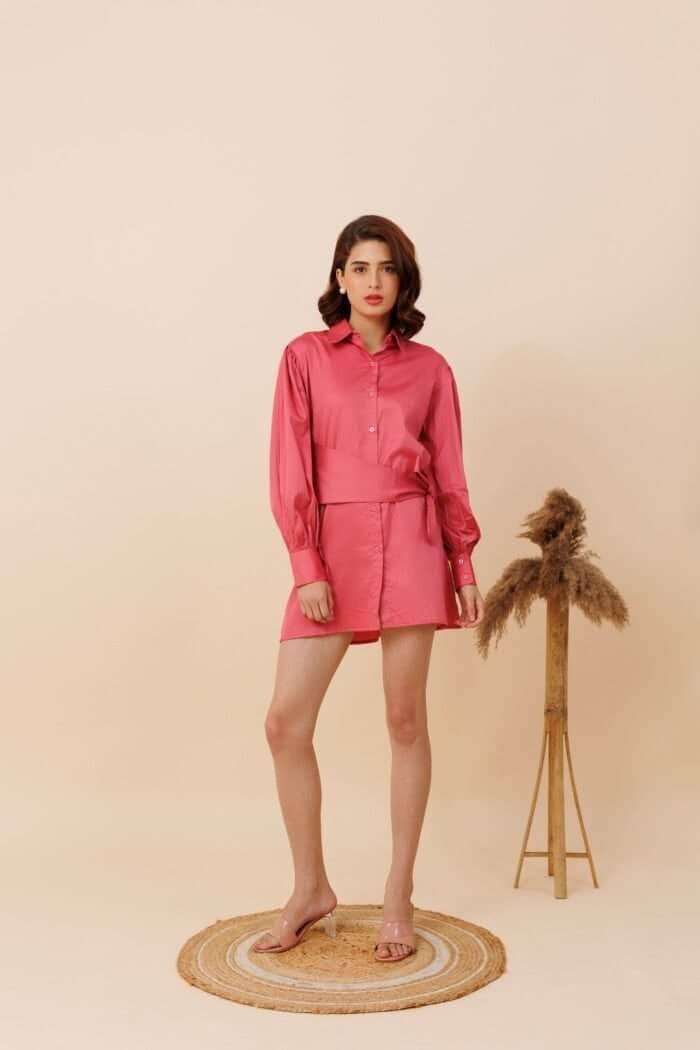 Pink oversized midi shirt dress with regular collar, drop shoulders, back pleats, pleated sleeves, belt, rounded hem, and pockets. Made from breathable pure cotton. Designed for comfort and ease.