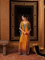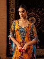 This vibrant orange kaftan features multicolored embroidery with paisley, floral, and geometric motifs in blues, purples, and gold. Crafted from luxurious fabric, it has a wide silhouette with detailed borders. Suitable for formal and festive occasions.