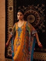 Stand out in this vibrant orange kaftan, richly embroidered with intricate paisley and floral designs. Featuring bold blue, purple, and gold motifs that contrast beautifully with the bright base, this flowing silhouette is finished with eye-catching geometric borders and detailed craftsmanship. Perfect for special events, cultural celebrations, or elegant evenings, this kaftan delivers a stunning statement look.