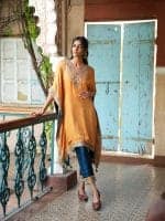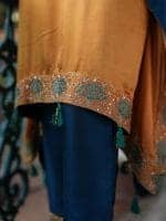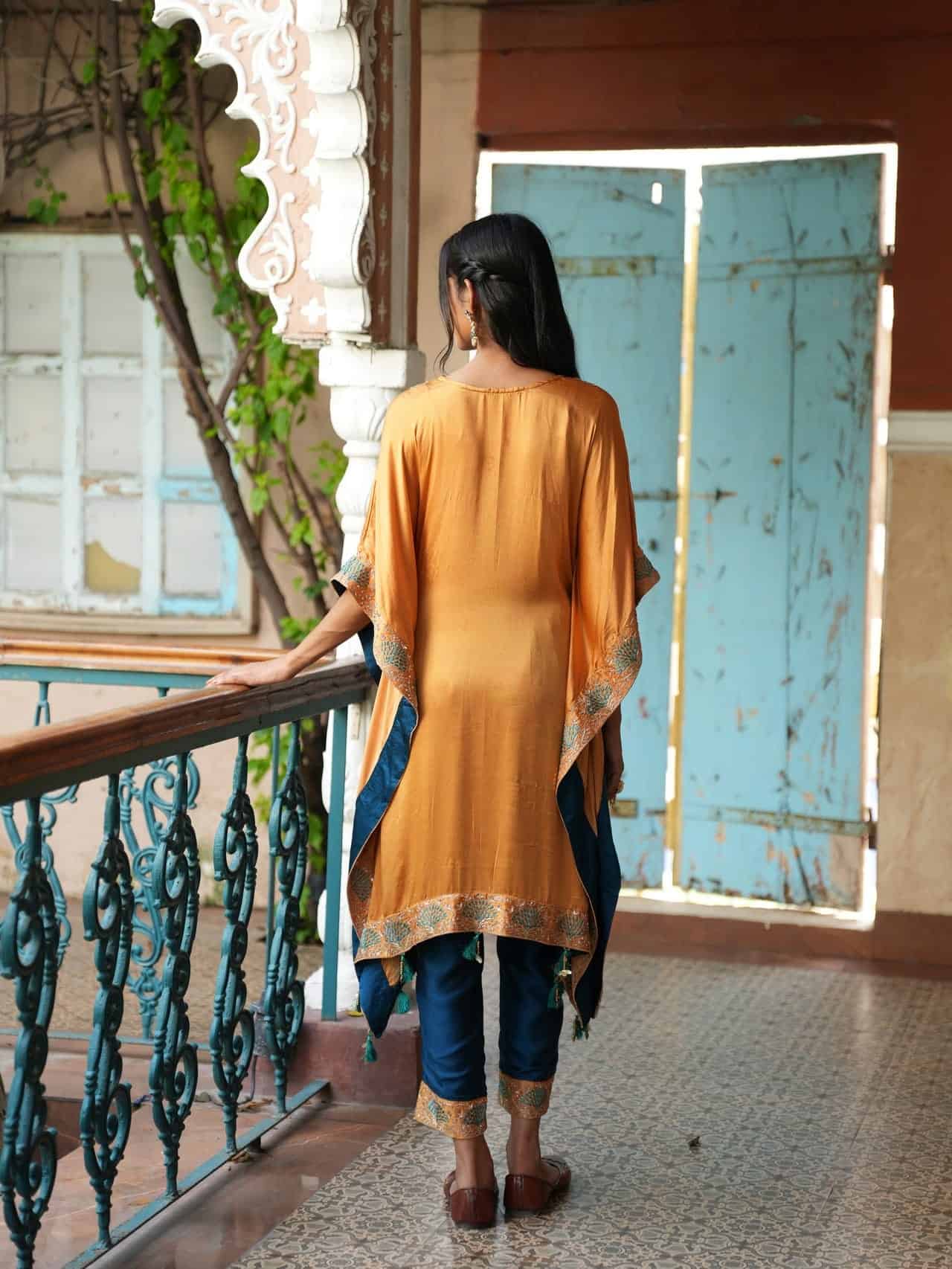 Stand out in this stunning saffron kaftan, crafted from luxurious silk and adorned with intricate rose gold and turquoise embroidery on the neckline and sleeves. Paired with deep teal pants featuring matching embroidered borders, this contemporary ensemble combines bohemian comfort with timeless traditional artistry.
