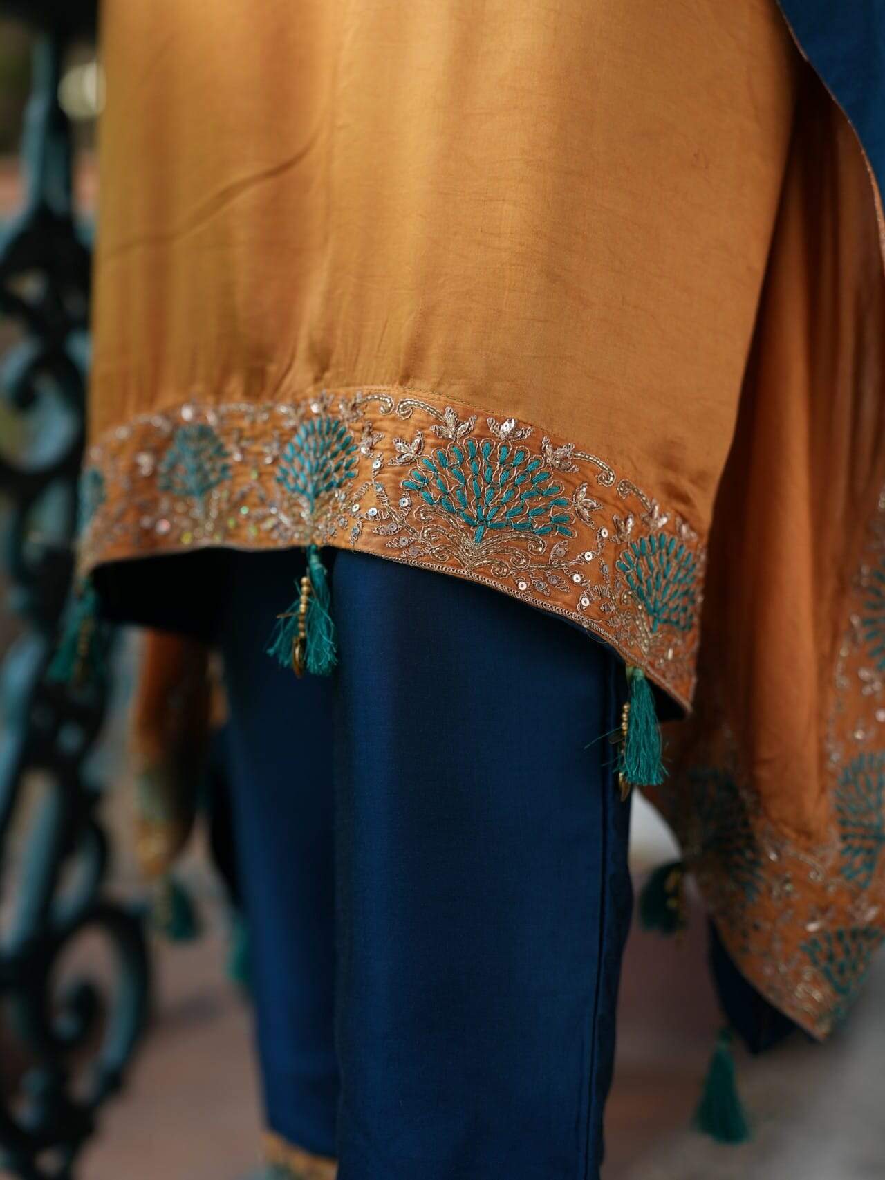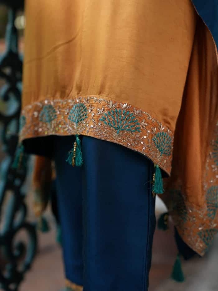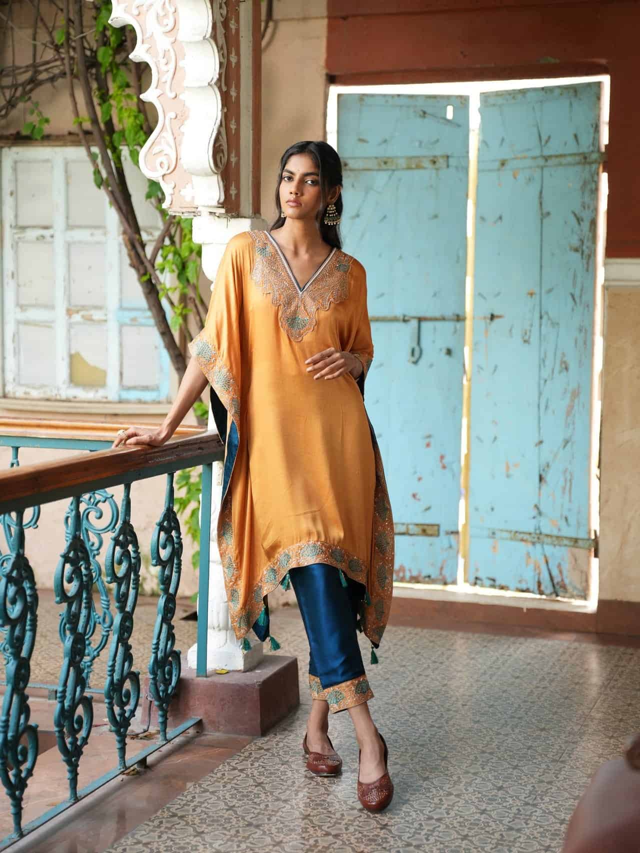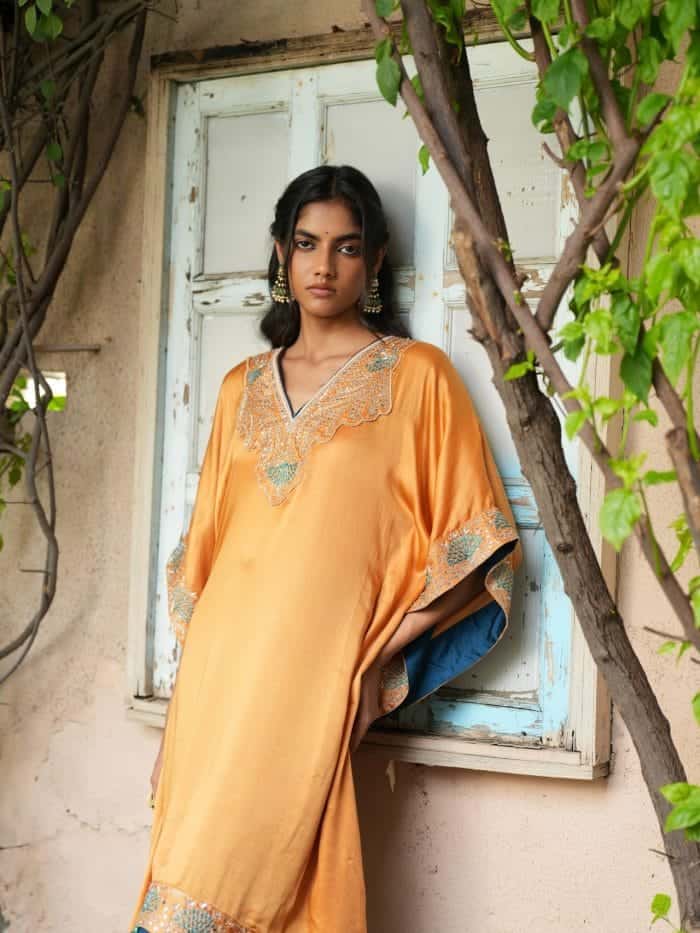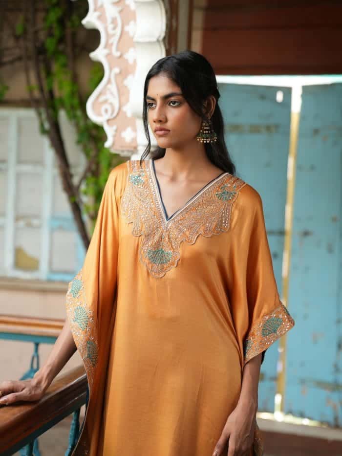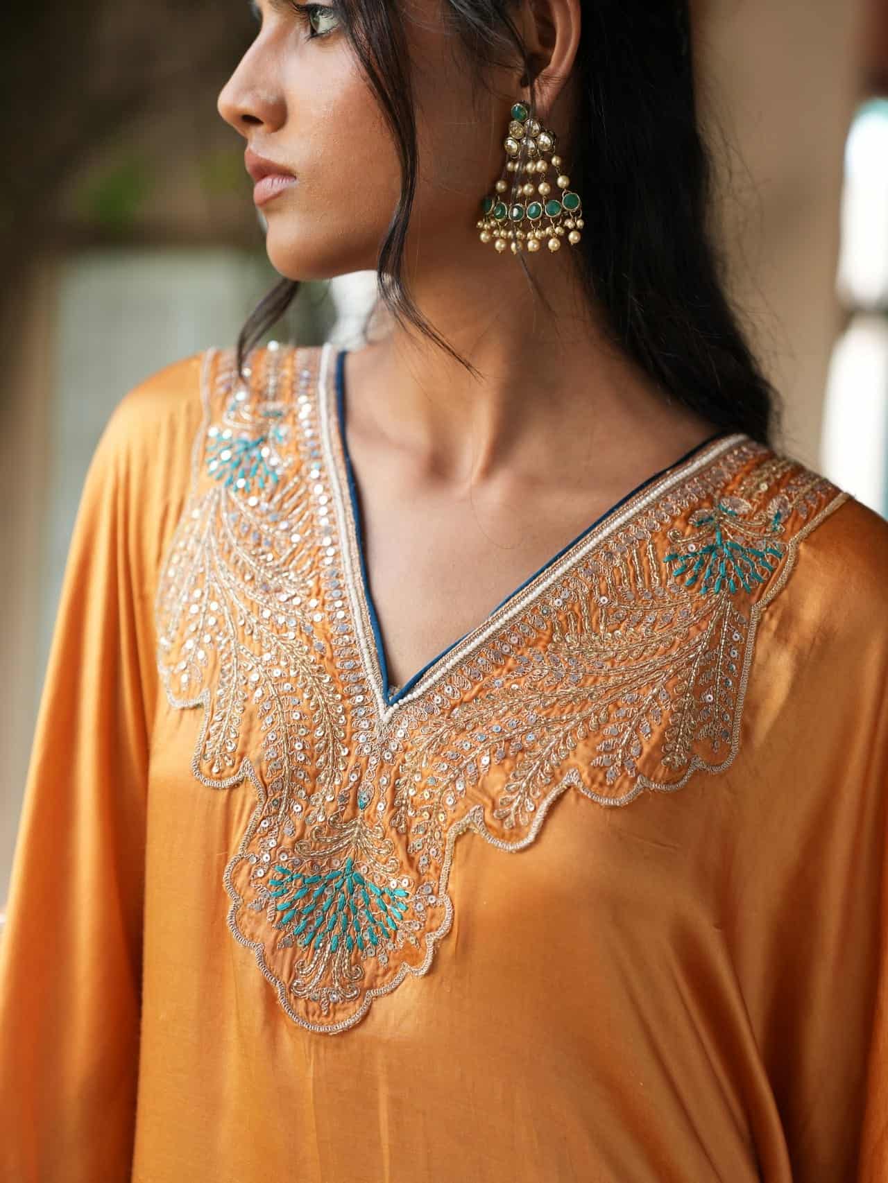 This saffron silk kaftan features rose gold and turquoise embroidery on the neckline and sleeves, paired with deep teal pants with matching embroidered borders.