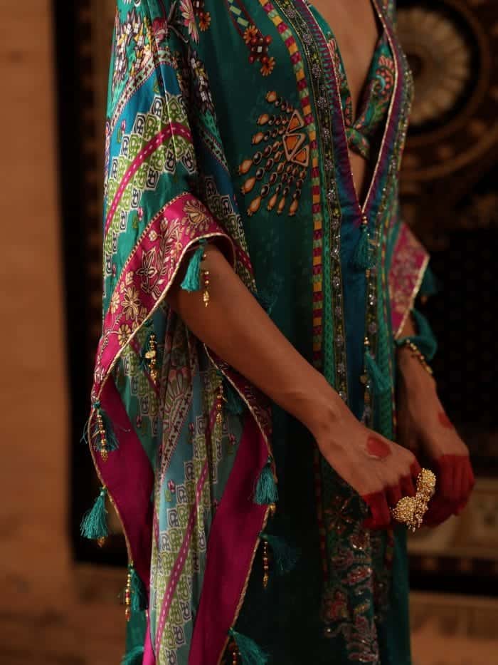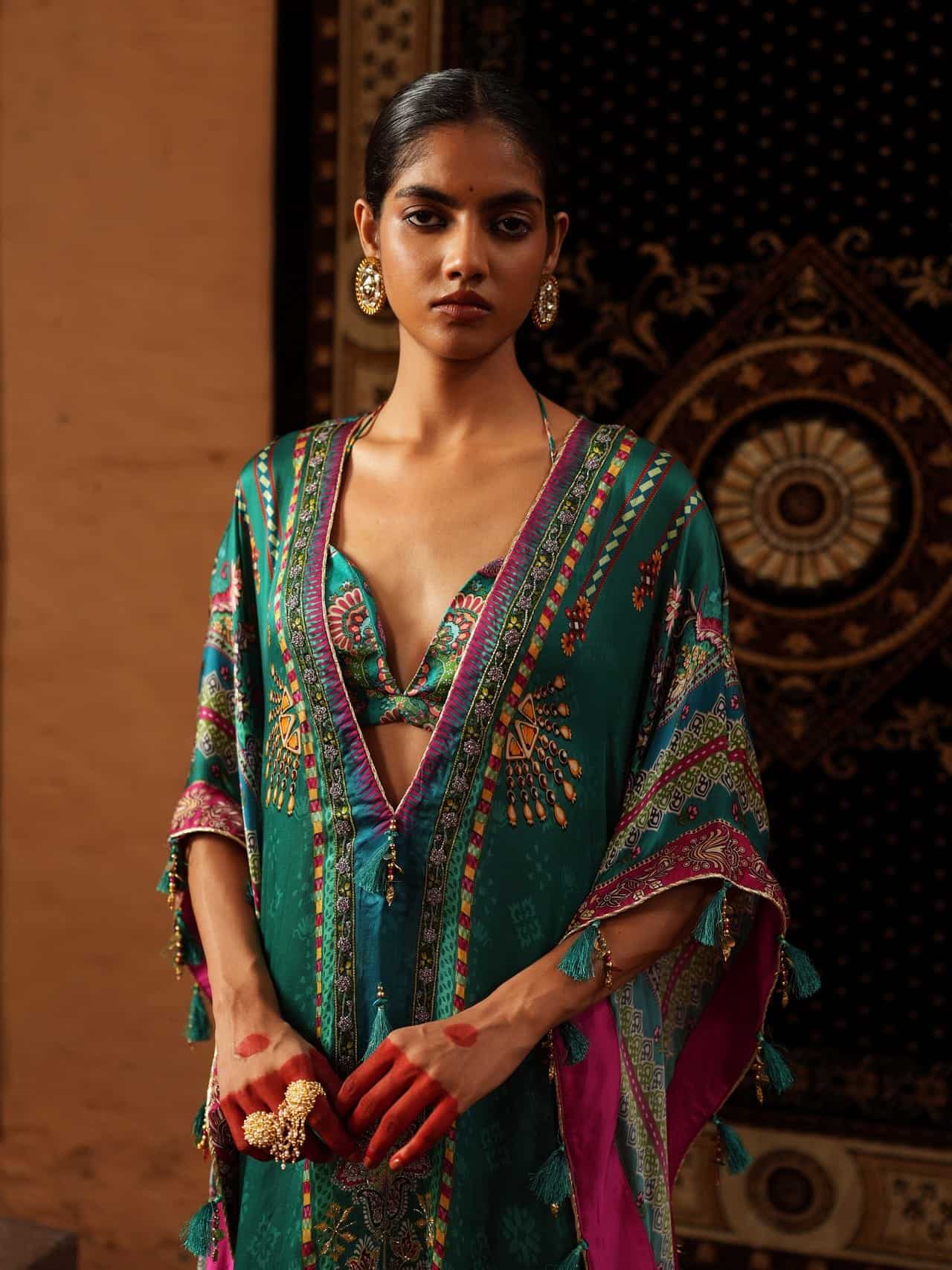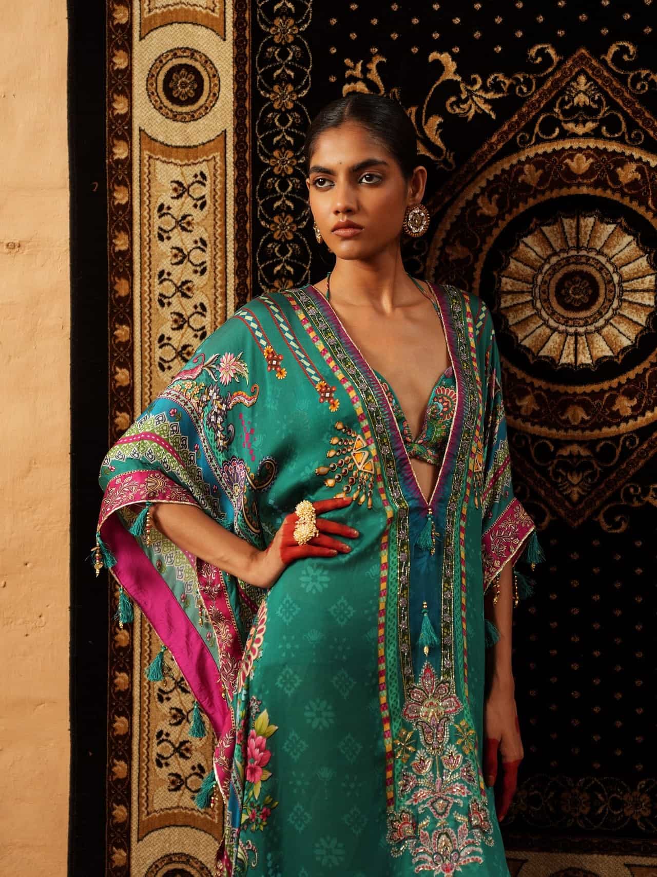 This emerald green kaftan features multicolored paisley and floral embroidery, with contrasting pink borders on the inner sleeves. Made from luxurious fabric, it is paired with a matching printed bralette.