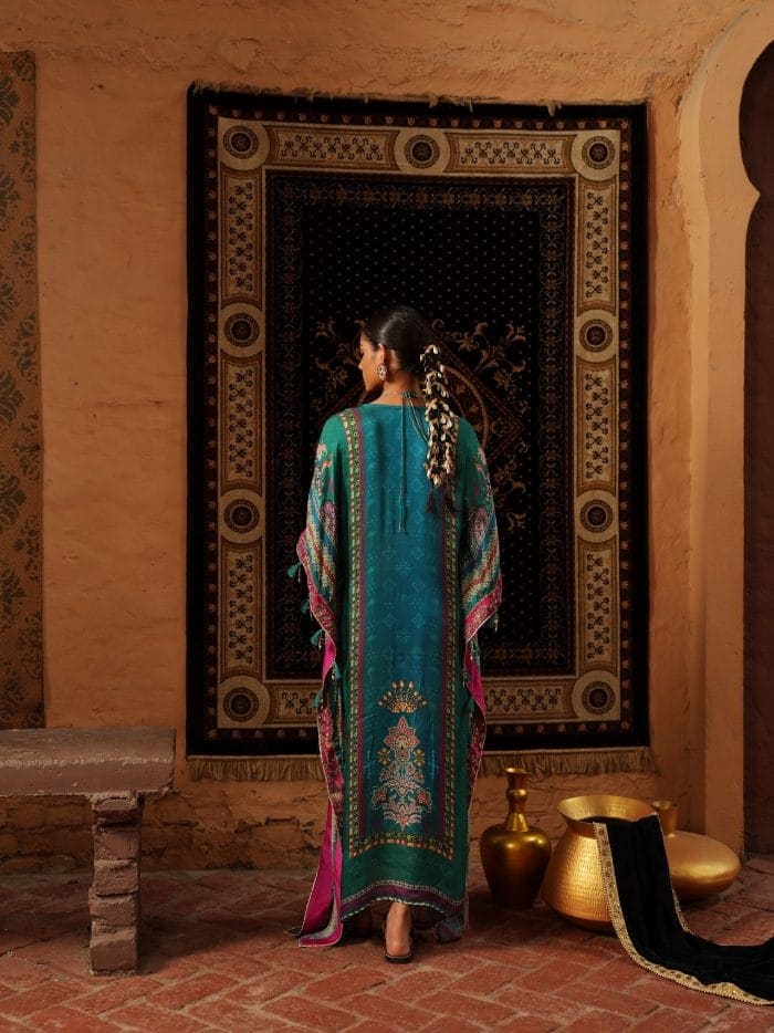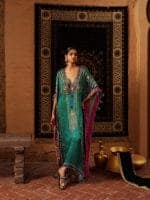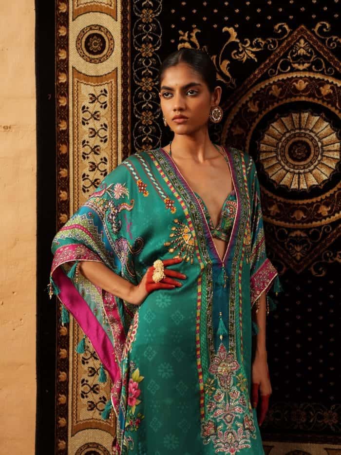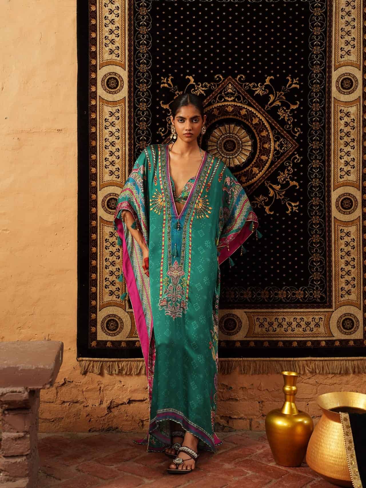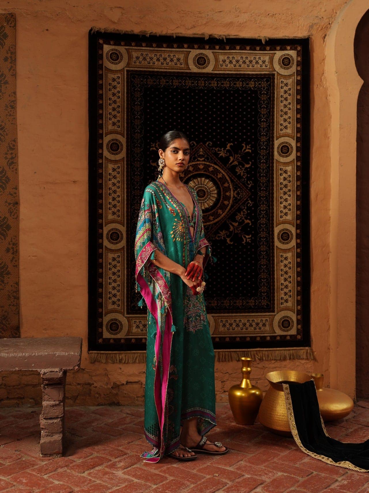 This emerald green kaftan features multicolored paisley and floral embroidery, with contrasting pink borders on the inner sleeves. Made from luxurious fabric, it is paired with a matching printed bralette.