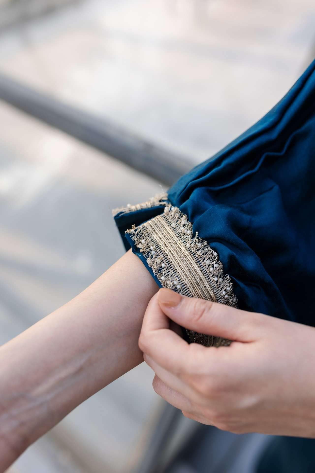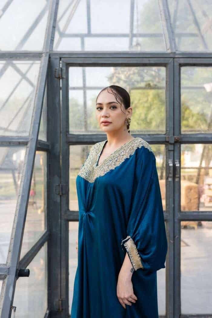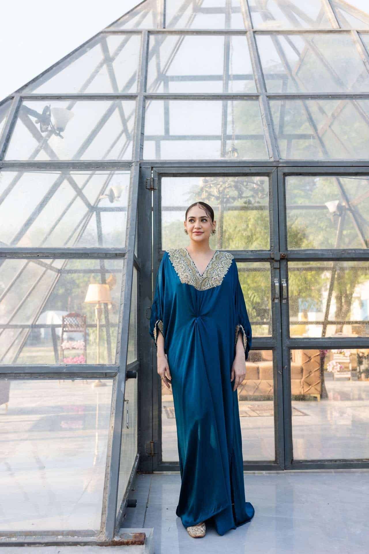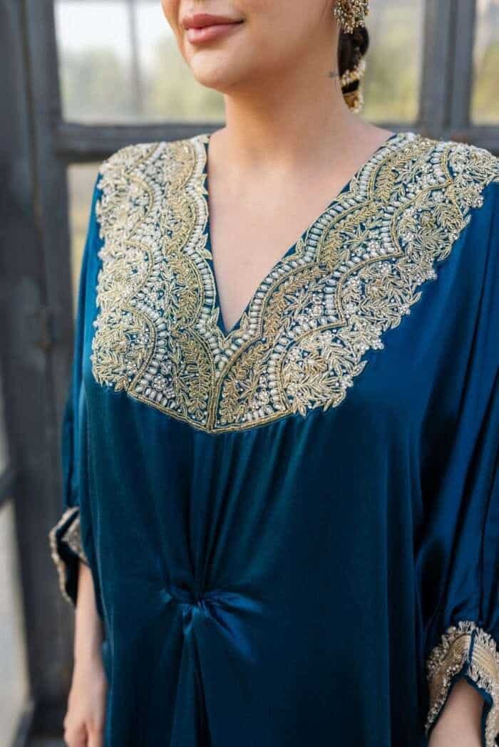 Floor-length modal satin kaftan with a V-neckline and detailed embroidered neck. Drapes from shoulder to ankle, combining comfort with elegant design.