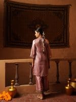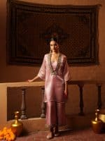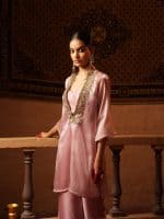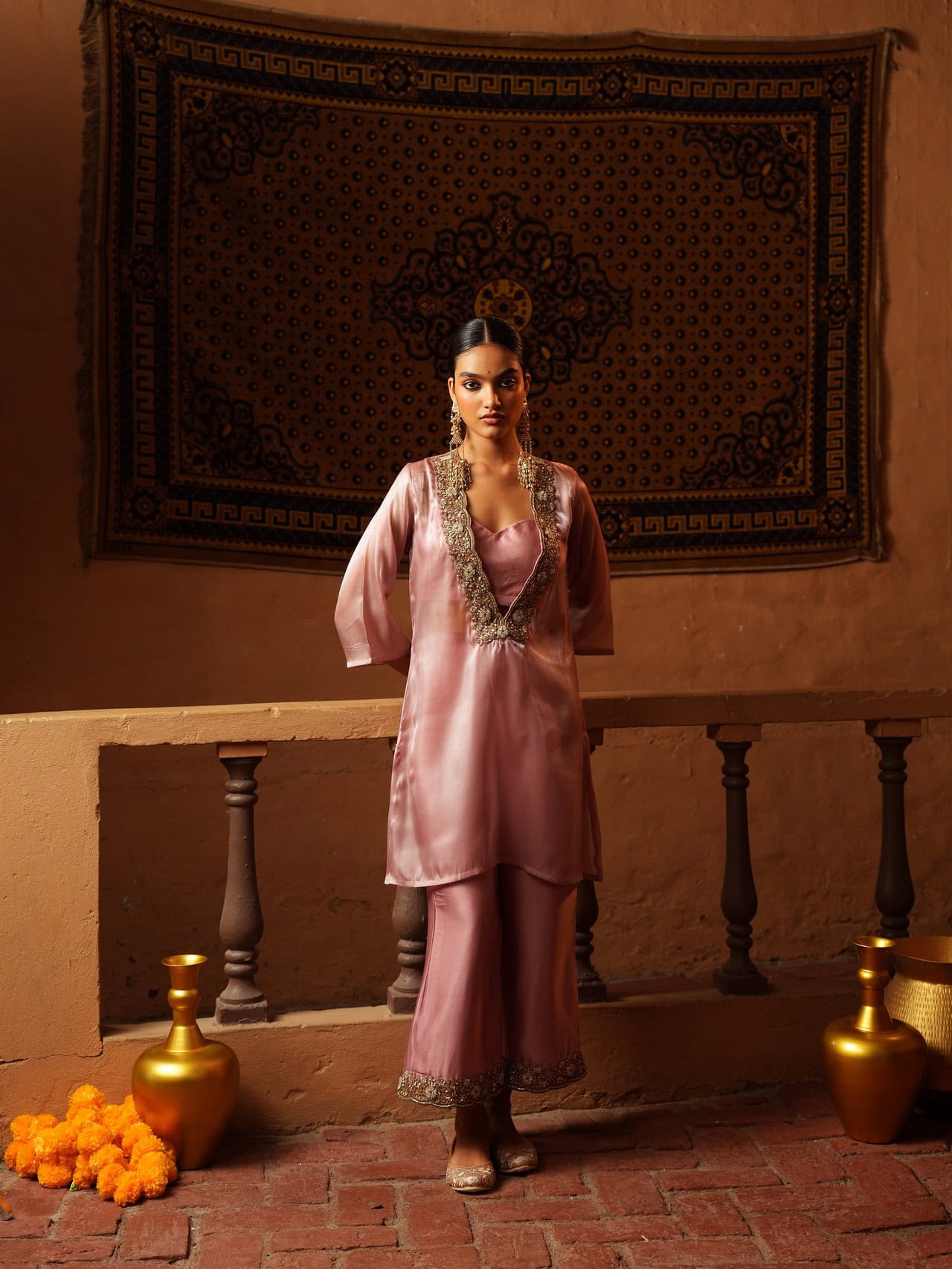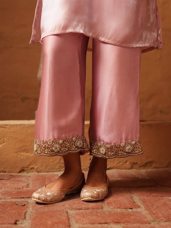 Elevate your wardrobe with this stunning three-piece blush pink ensemble. Featuring a silk kurta adorned with exquisite golden zardozi work along the low neckline, a matching embroidered bralette for a contemporary edge, and coordinating palazzo pants with intricate golden borders, this set blends sophistication with modern royalty.