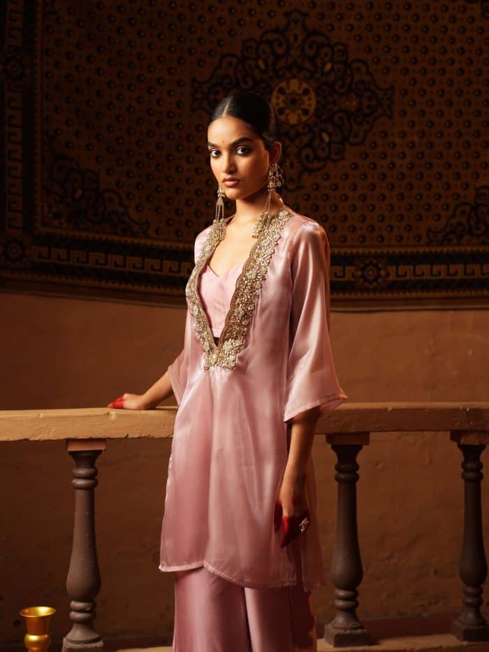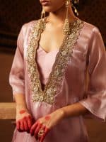 This three-piece blush pink ensemble includes a silk kurta with golden zardozi embroidery on the low neckline, an embroidered bralette, and palazzo pants with golden borders.Fabric