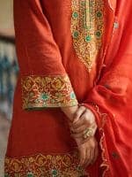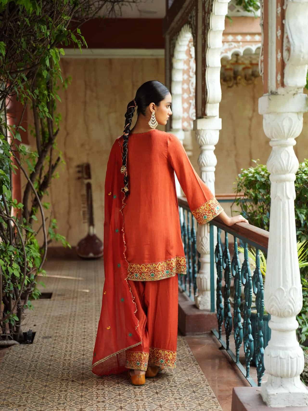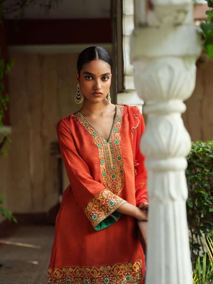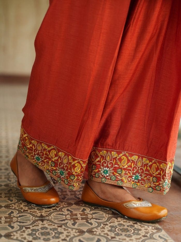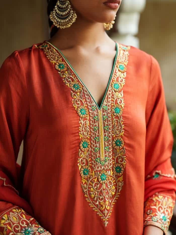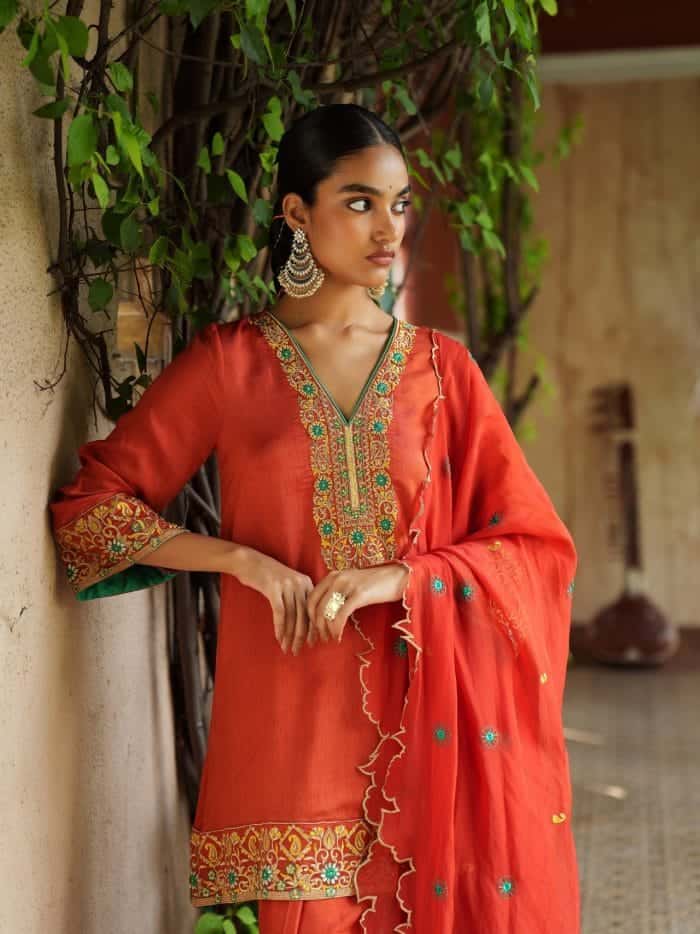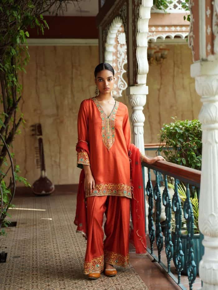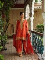 The Surya Rani Ensemble includes a saffron-orange kurta with golden floral and paisley embroidery, a deep V-neckline, and matching sleeves. It’s paired with palazzo pants featuring border detailing and a complementary dupatta with subtle embellishments.
