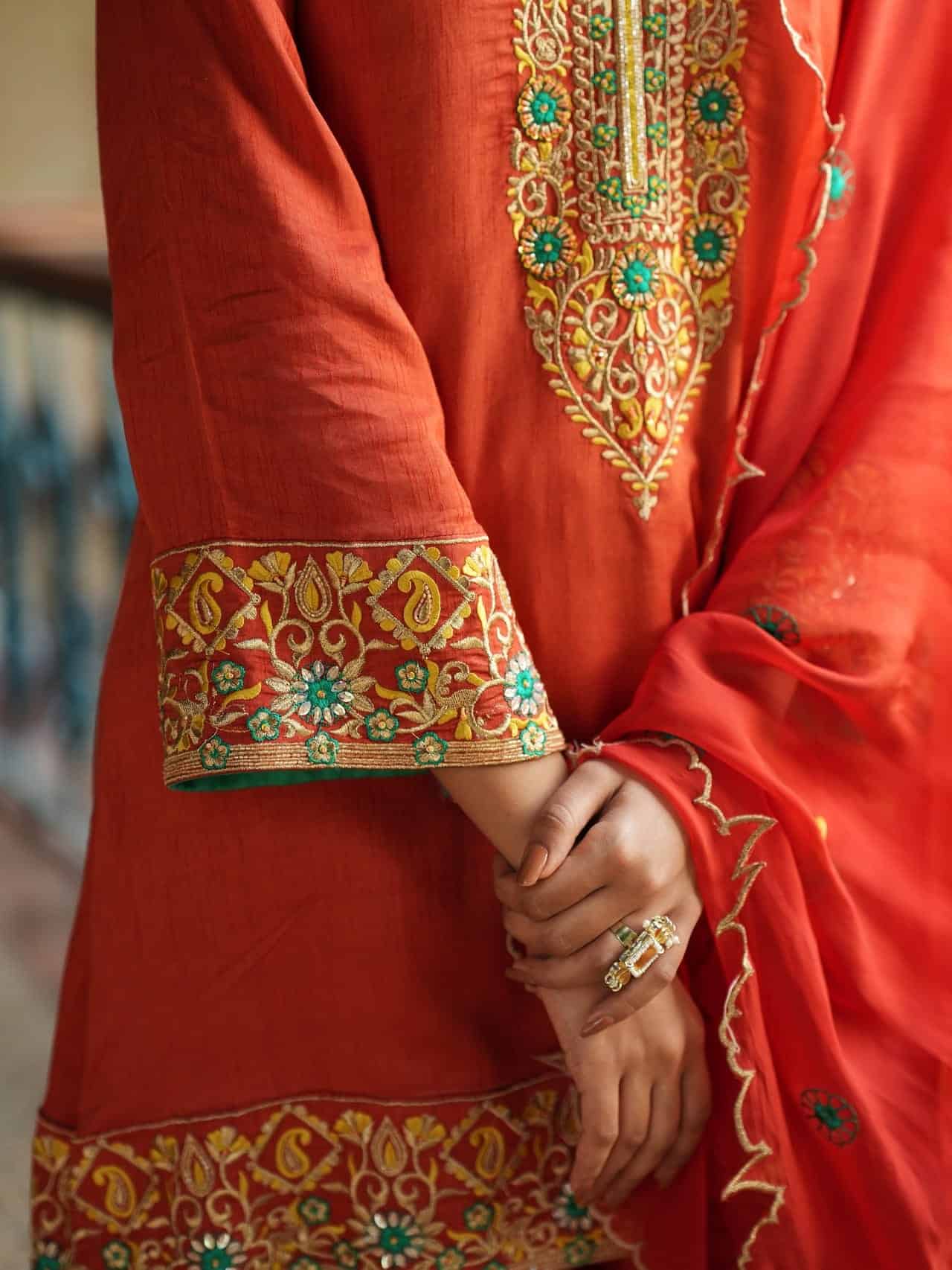 Intricate Gold & Green Embroidery, Rich Saffron Hue, Complete Three-Piece Set, Farsi Salwar Style