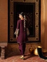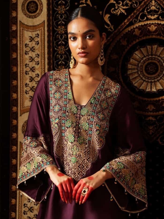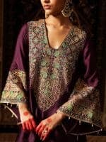 Make a grand statement with this deep purple ensemble, featuring dazzling mirror work and vibrant embroidery. The jamuni kurta showcases intricate floral designs on the yoke and sleeves, highlighted by dramatic bell sleeves with ornate borders. Paired with contemporary dhoti-style pants, this outfit perfectly blends traditional craftsmanship with modern style.