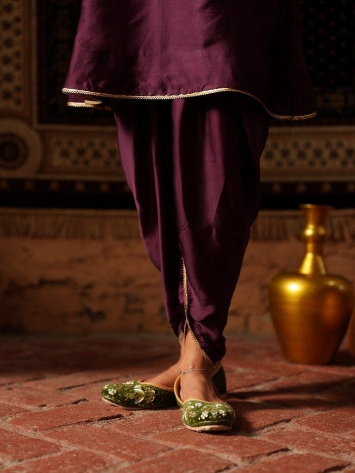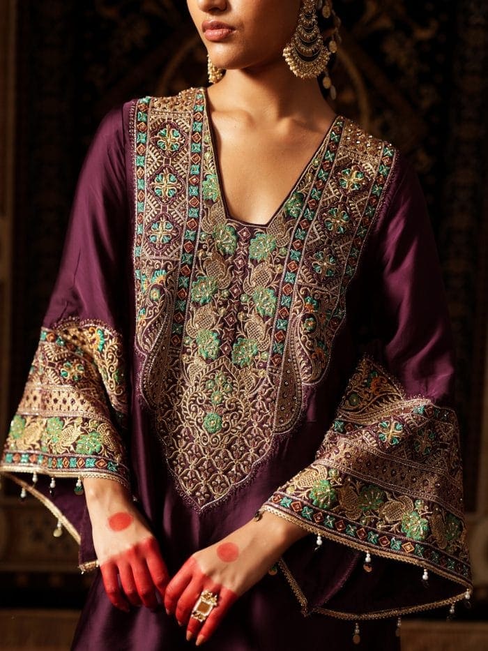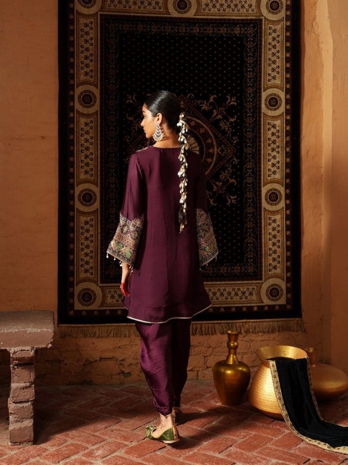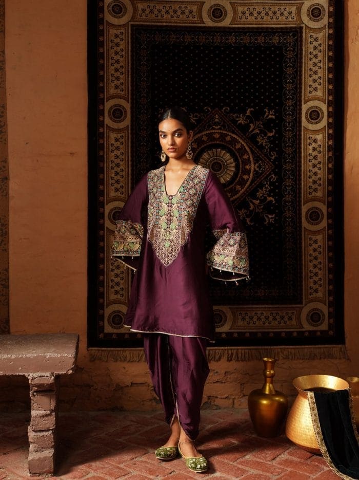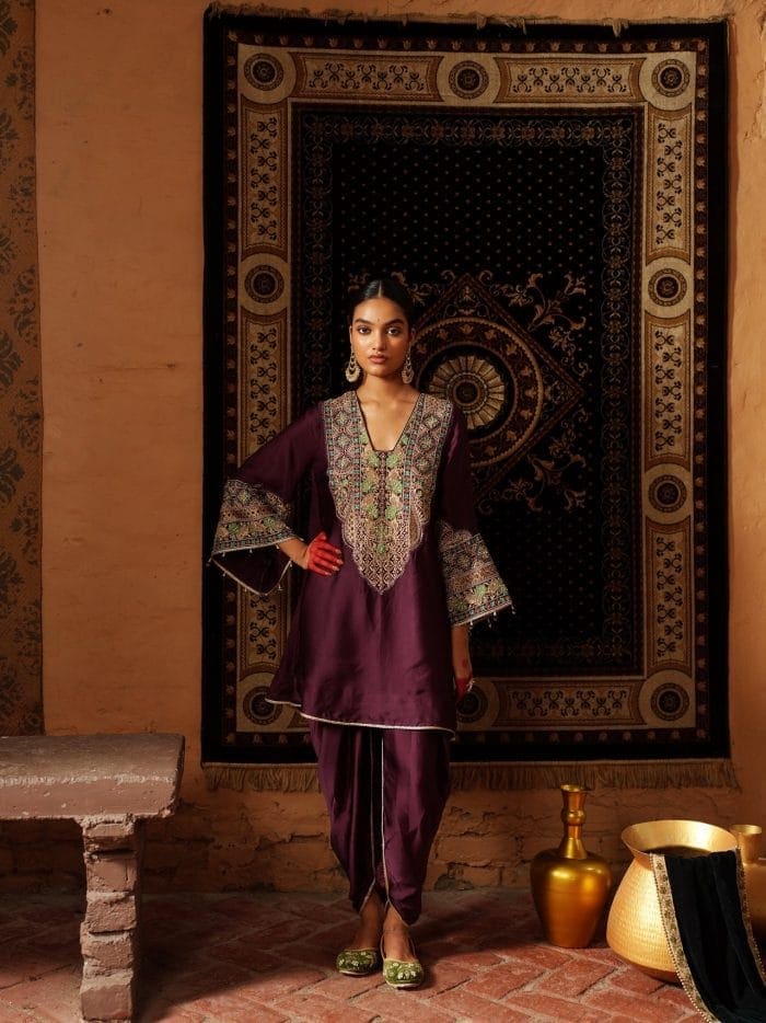 This deep purple ensemble includes a jamuni kurta with mirror work and floral embroidery on the yoke and sleeves, bell sleeves with ornate borders, and matching dhoti-style pants.