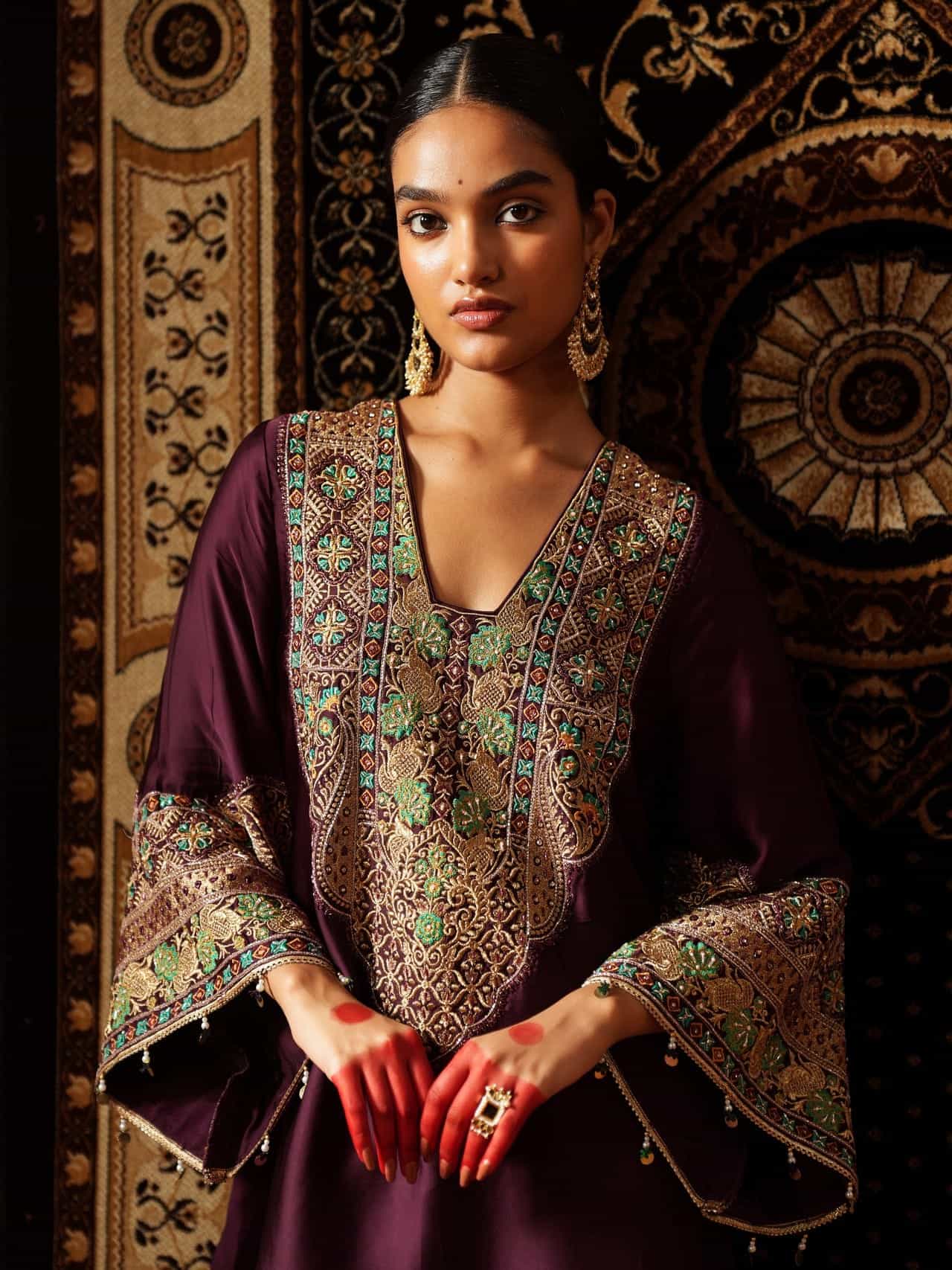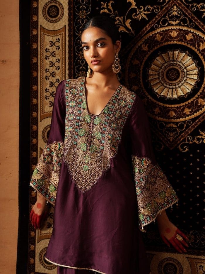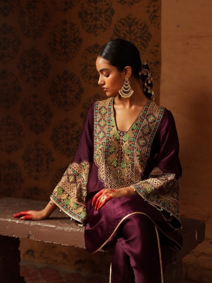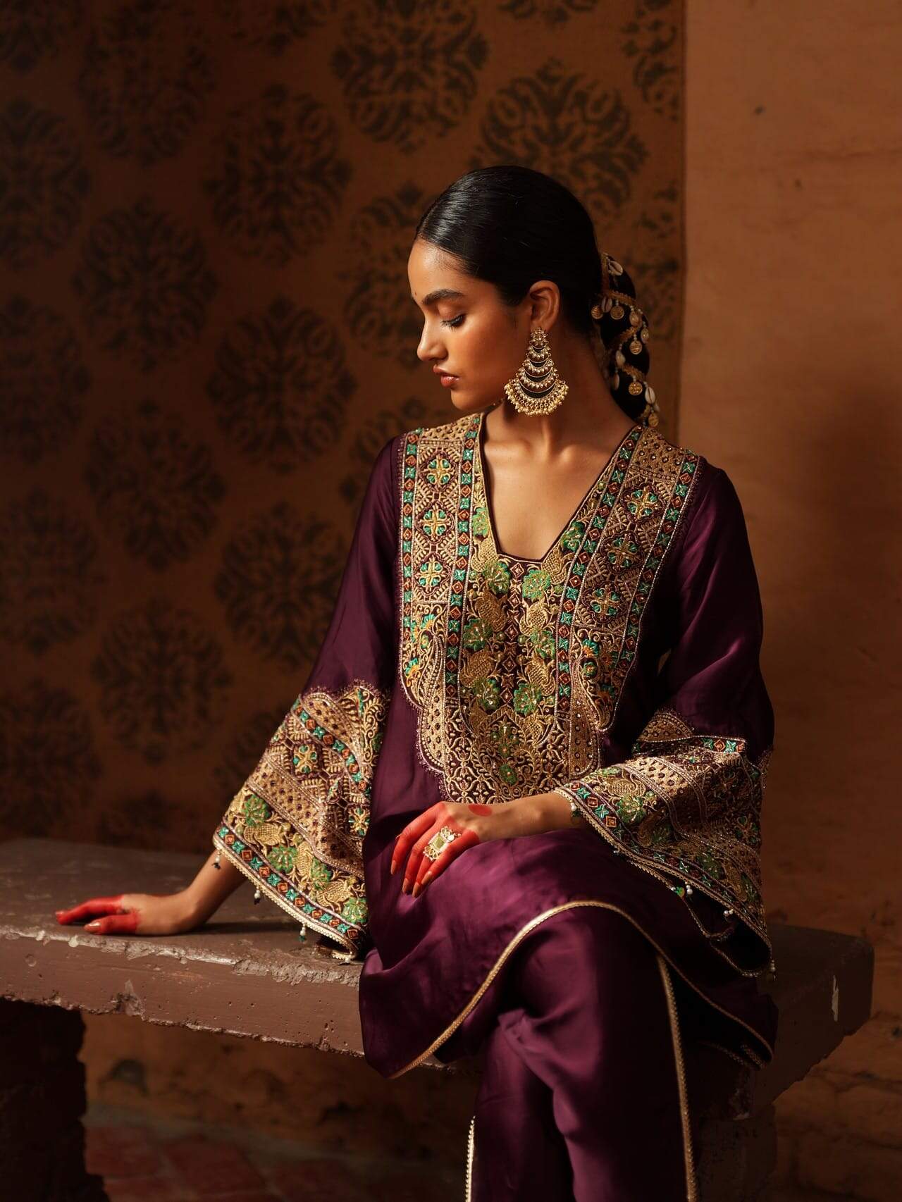This deep purple ensemble includes a jamuni kurta with mirror work and floral embroidery on the yoke and sleeves, bell sleeves with ornate borders, and matching dhoti-style pants.