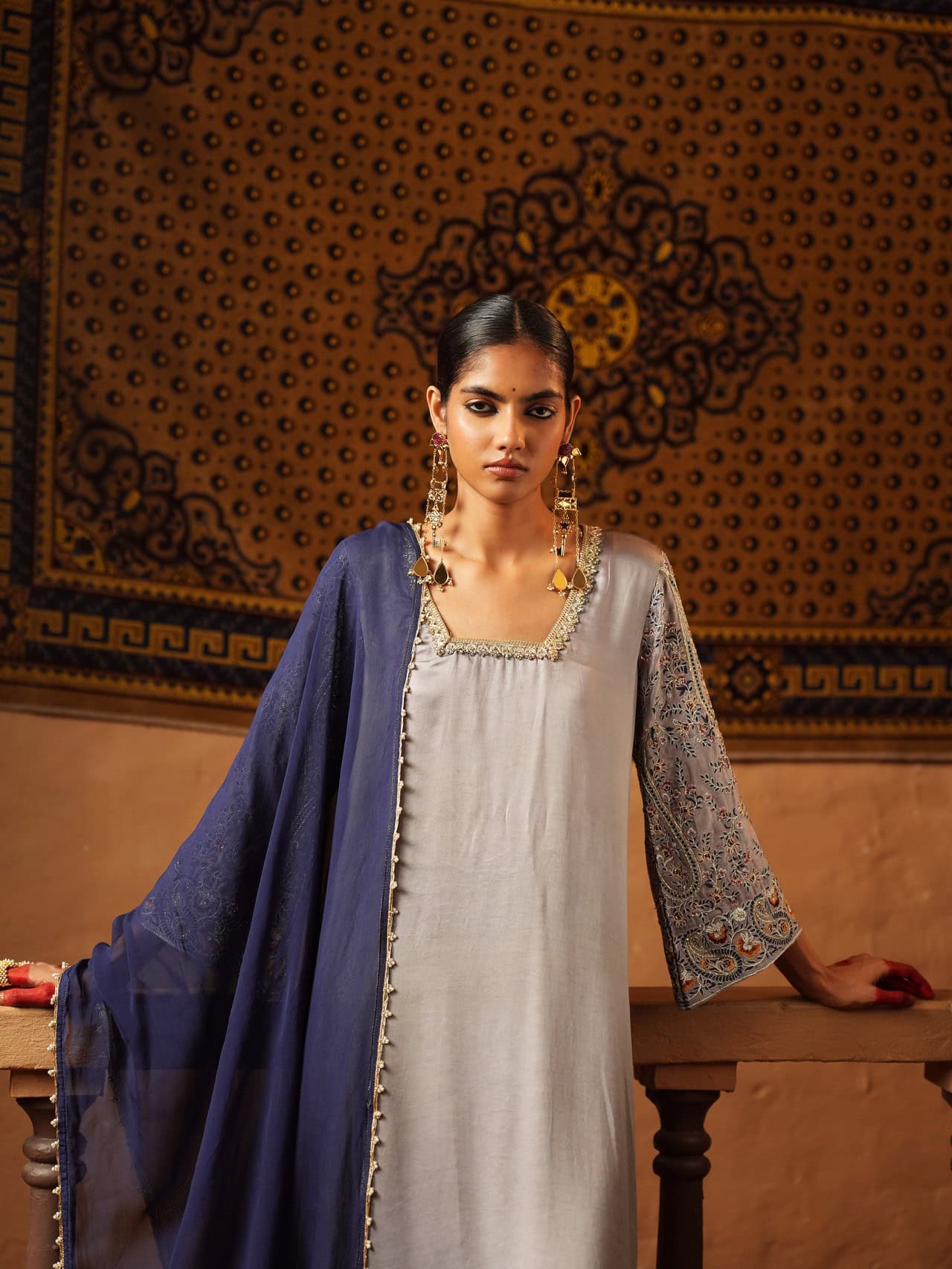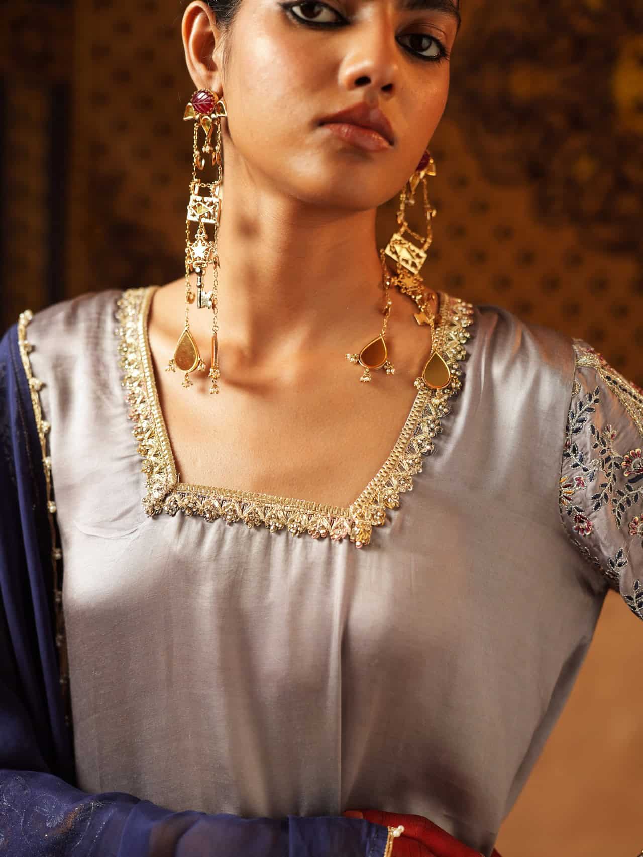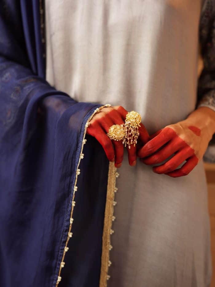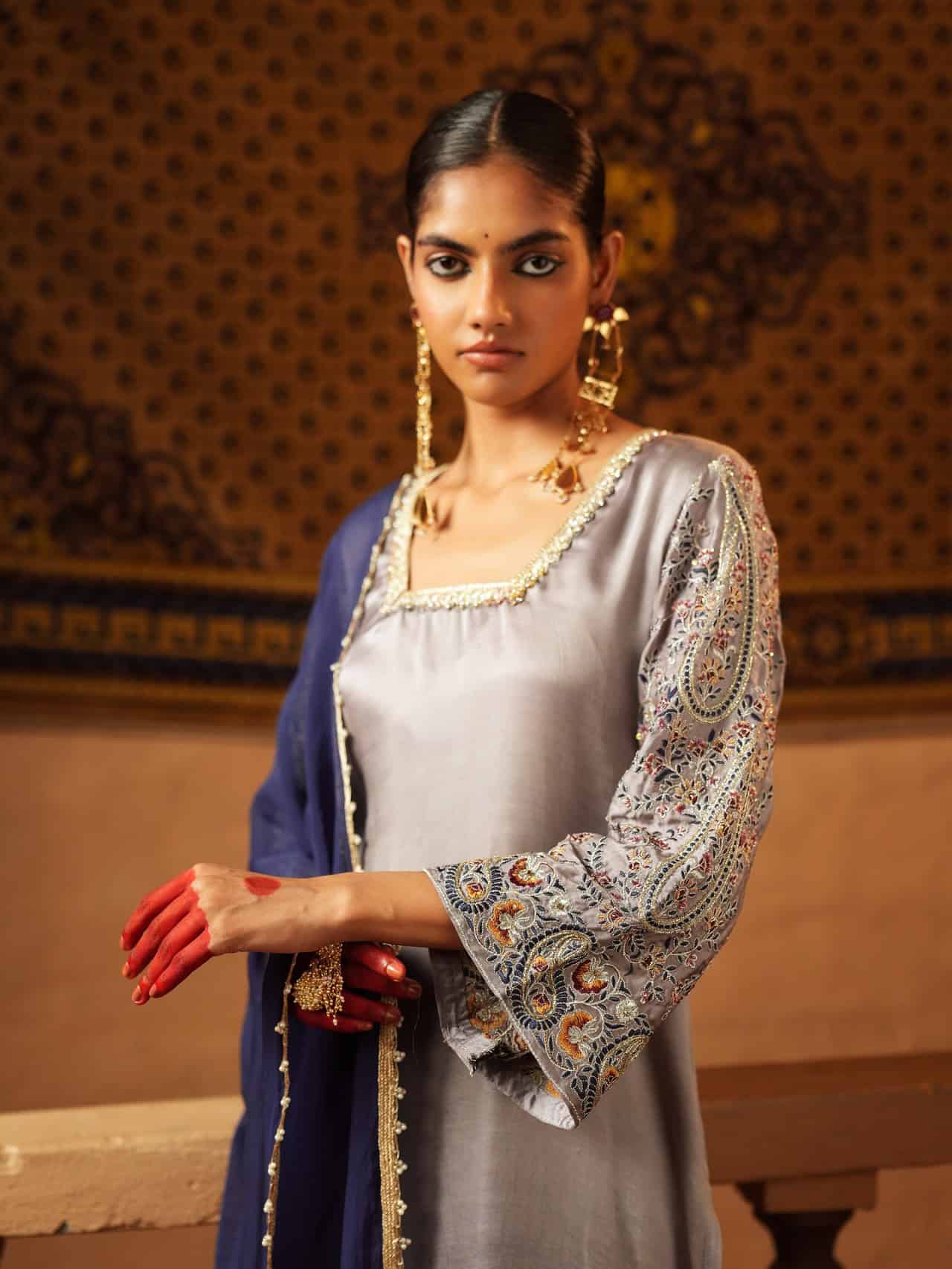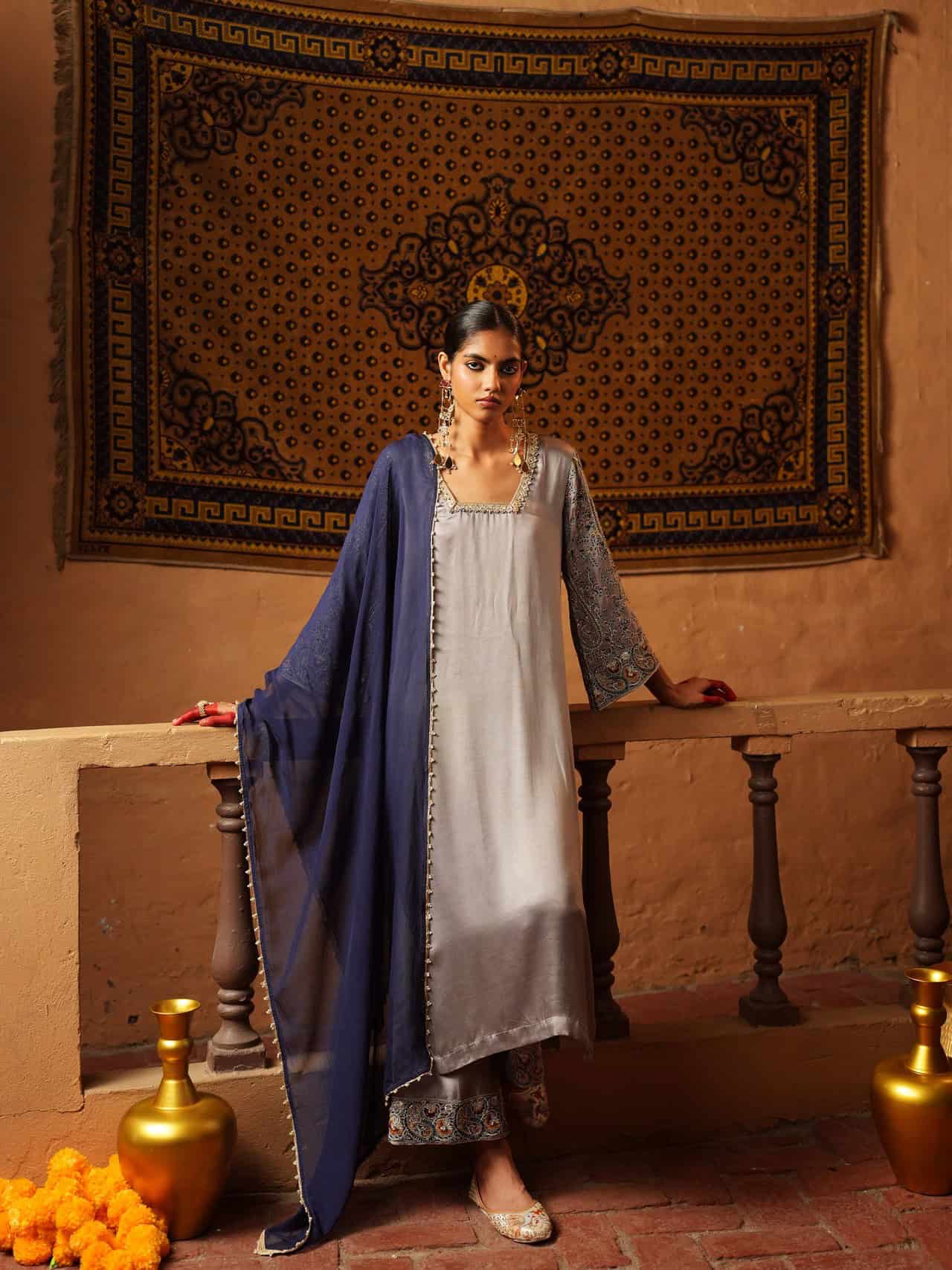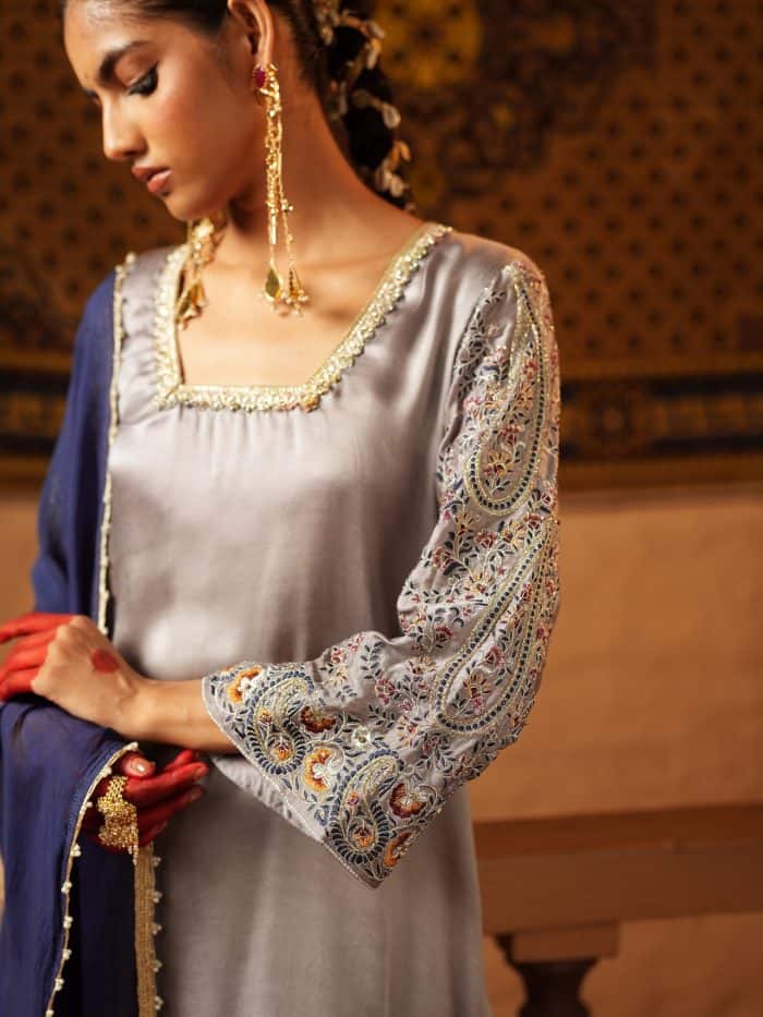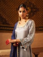 Elevate your wardrobe with this serene gray ensemble, where subtle embroidery meets elegant detailing. The soft gray kurta features refined stitching along the neckline and contrast accents on the sleeves, perfect for any time of day. Matching trousers with ornate borders and a navy blue dupatta with delicate embellishments complete this versatile, sophisticated look—ideal for casual gatherings or evening events.