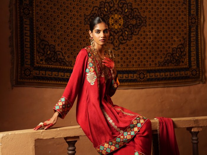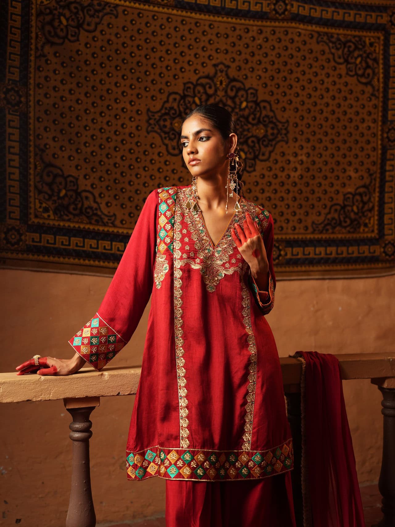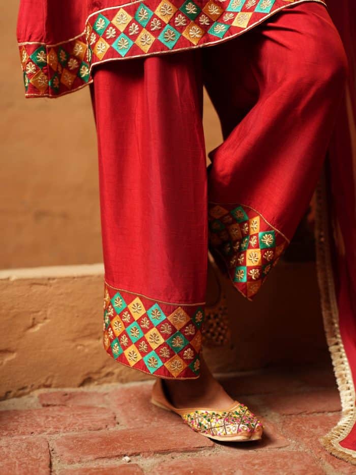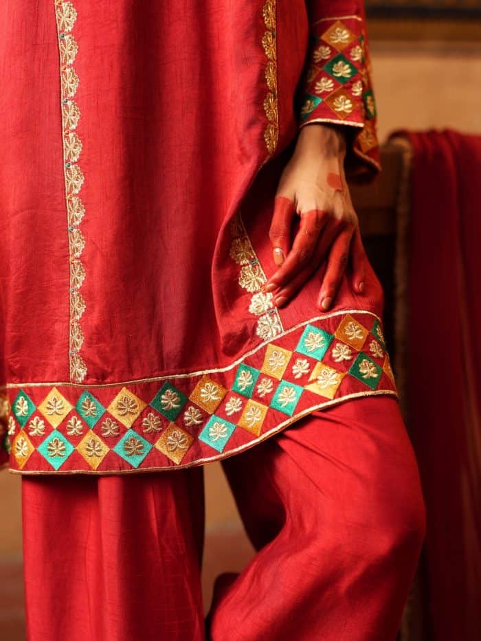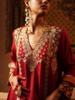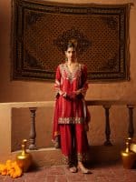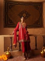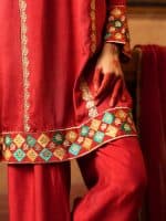 This red ensemble features a tunic with gold and emerald embroidery along the neckline, cuffs, and hem. Geometric and floral patterns add detail, and it is paired with a matching flowing dupatta. Perfect for festive or formal occasions.