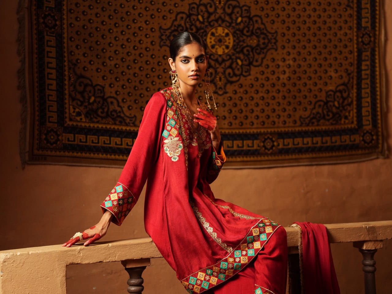 Golden and Emerald Embroidery, Geometric and Floral Motifs, Vibrant Red Color