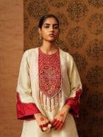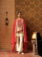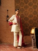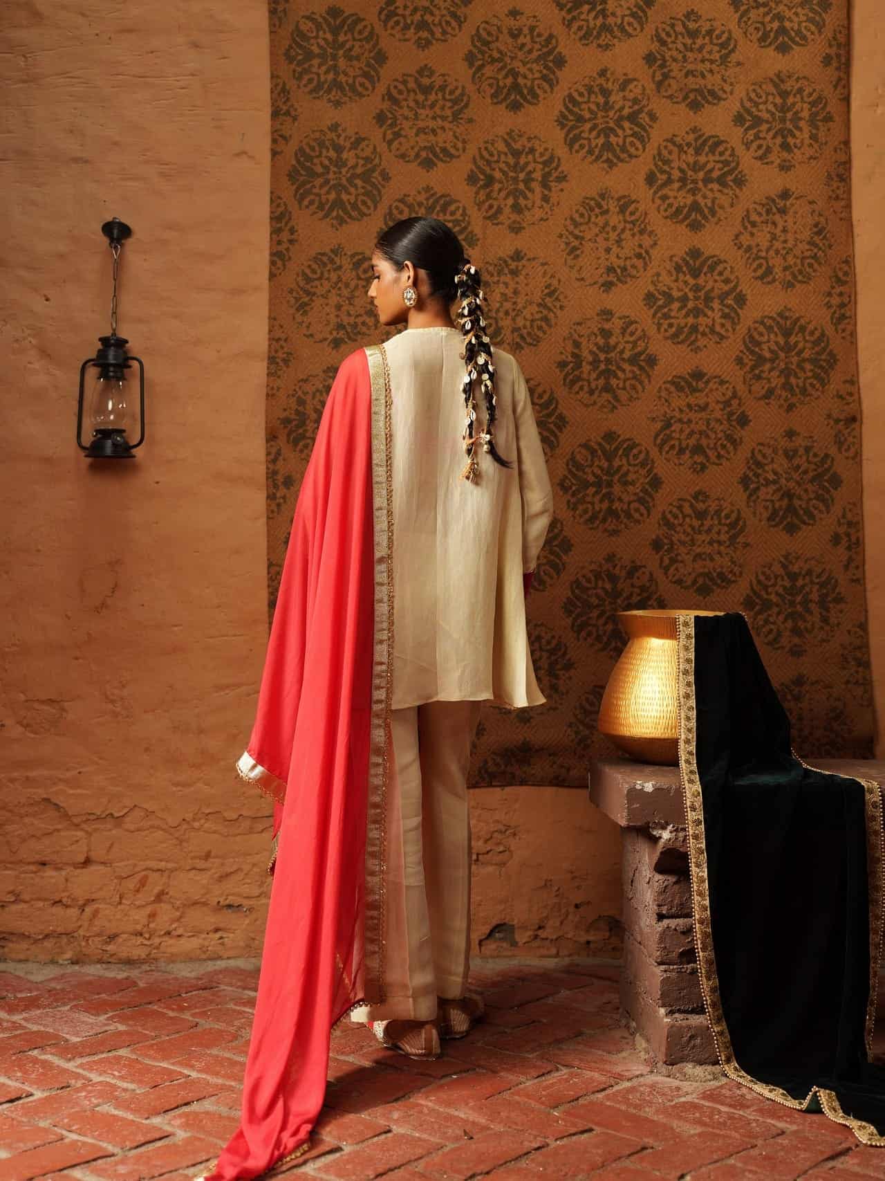 Elevate your style with this stunning ivory kurta, featuring intricate hand-embroidered crimson and gold threadwork and elegant tassel details. The bold coral-red dupatta with golden borders adds dramatic flair, while coordinating trousers complete this perfect blend of tradition and contemporary elegance.