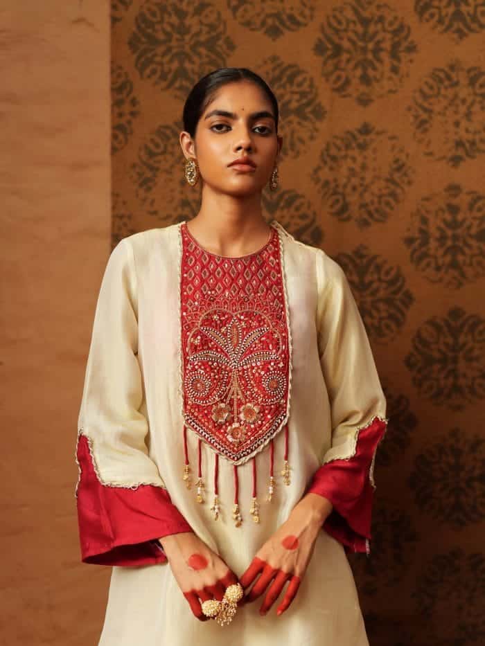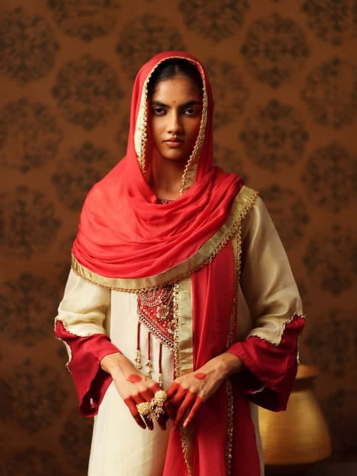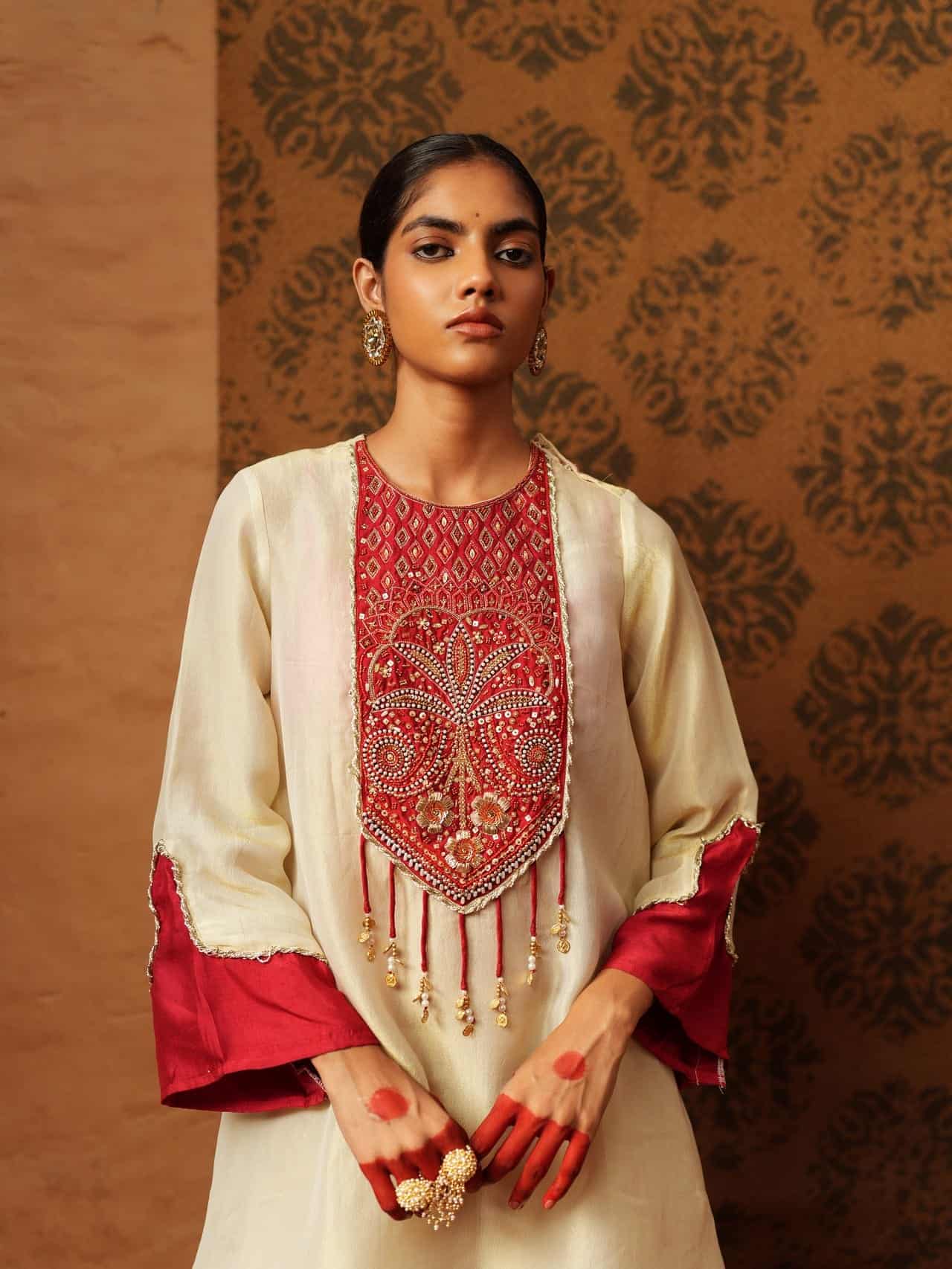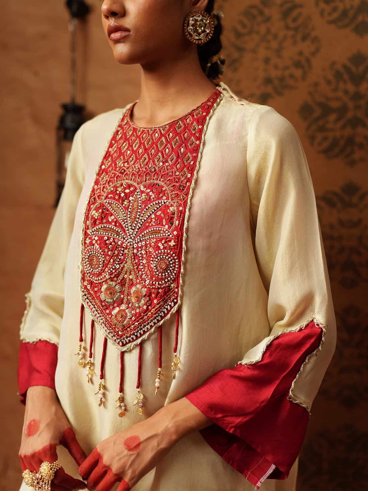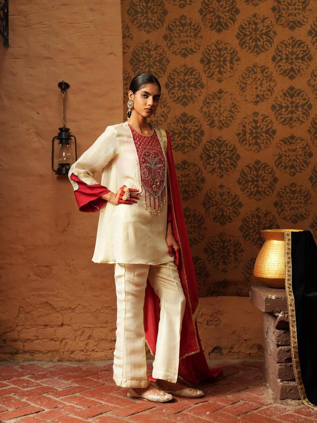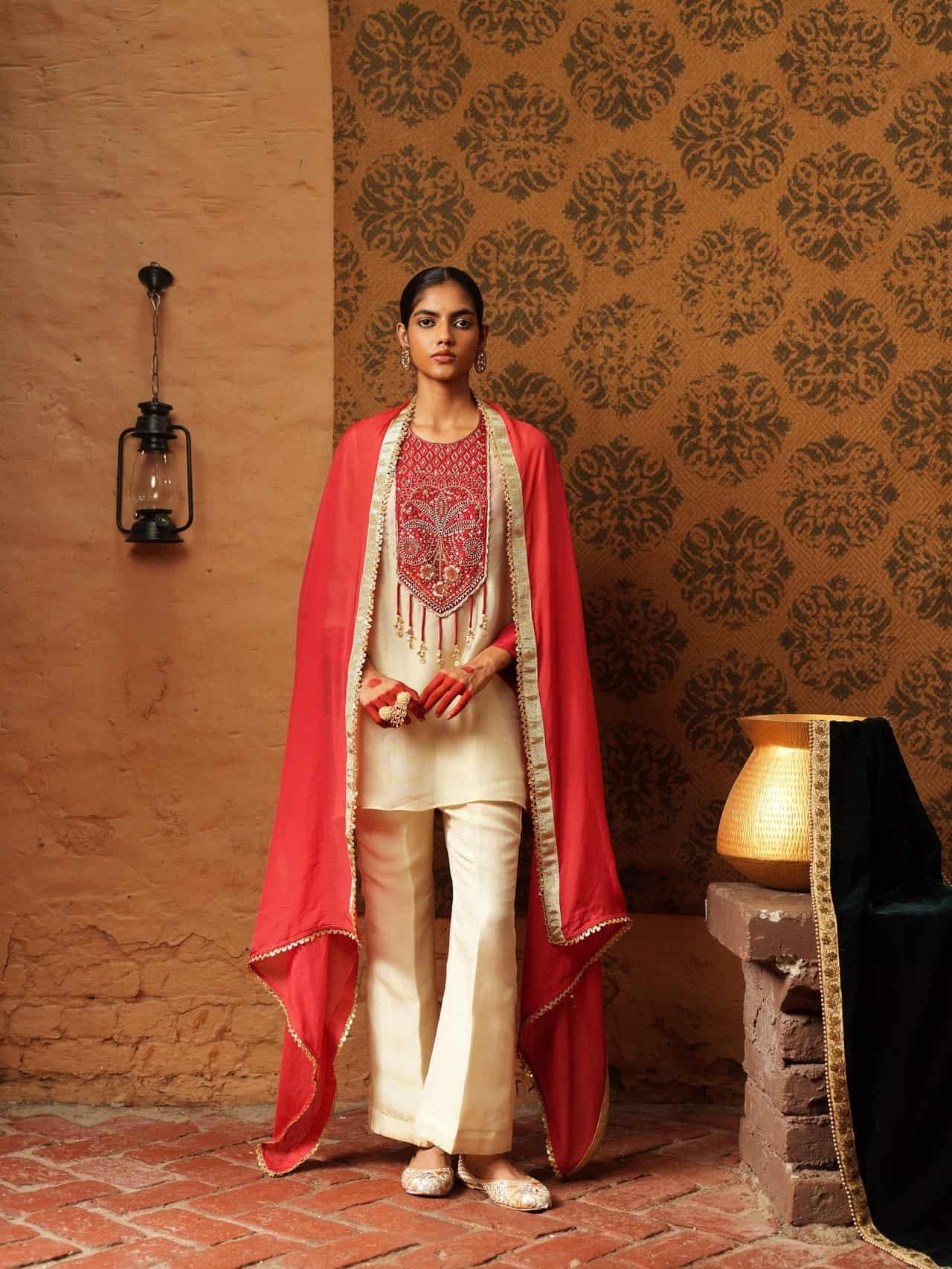 The ivory kurta has hand-embroidered crimson and gold threadwork with tassel accents. The coral-red dupatta features golden borders. Paired with coordinating trousers.