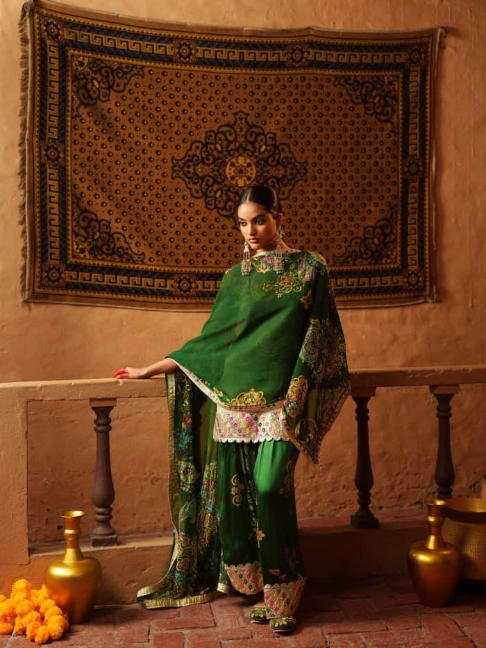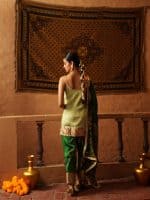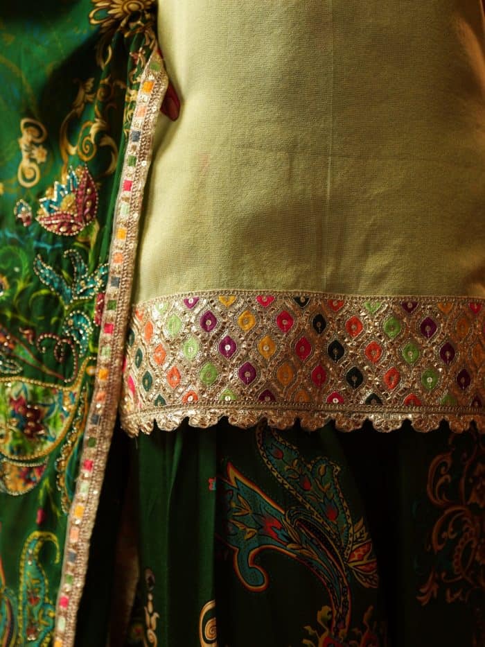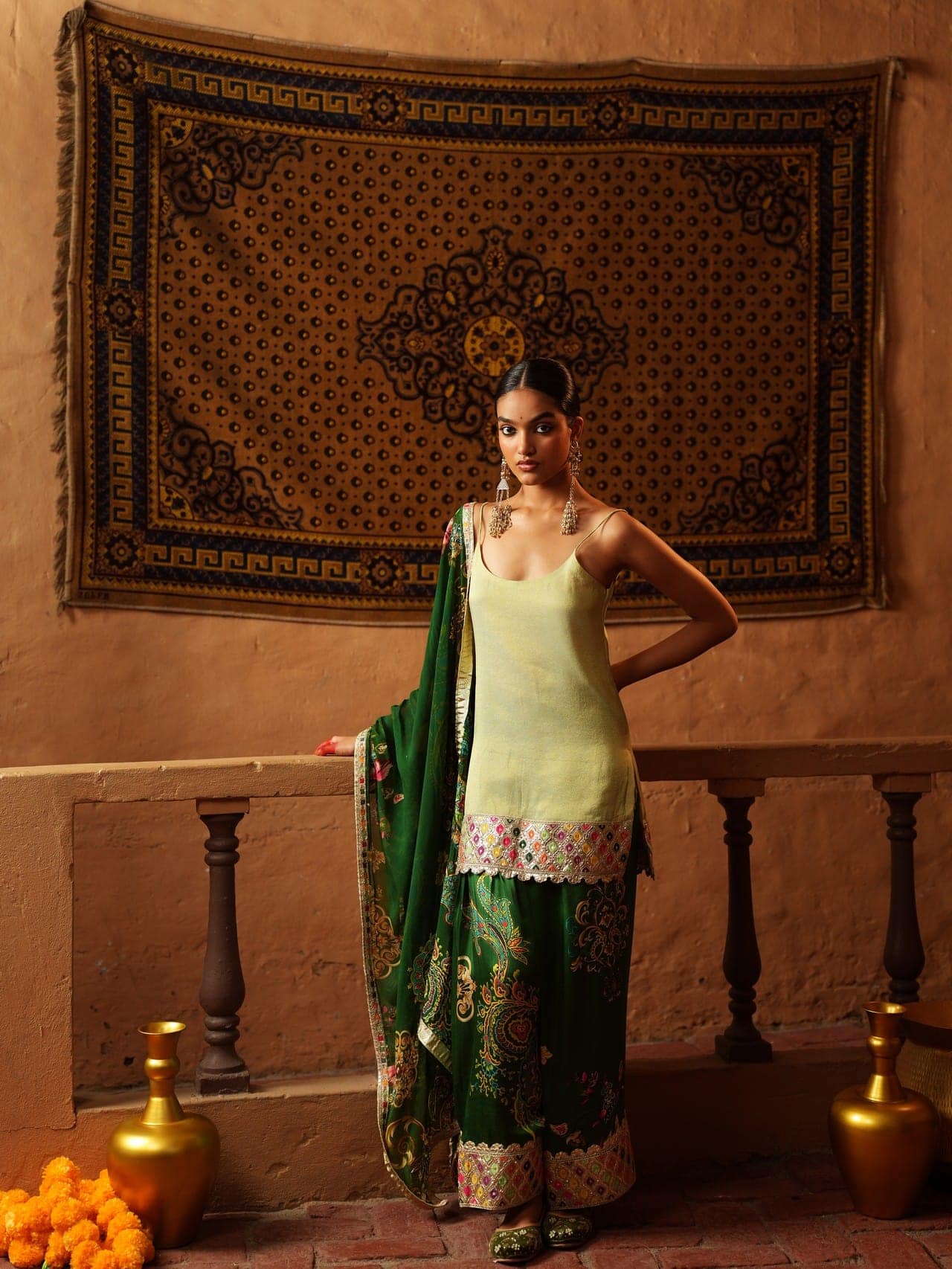 Refresh your wardrobe with this stunning three-piece ensemble in soft mint green. Featuring a sleek sleeveless kurta with delicate floral embroidery at the hemline, a vibrant emerald dupatta decorated with paisley prints and golden borders, and coordinating palazzo pants with matching embroidery, this look is the perfect blend of elegance and style.