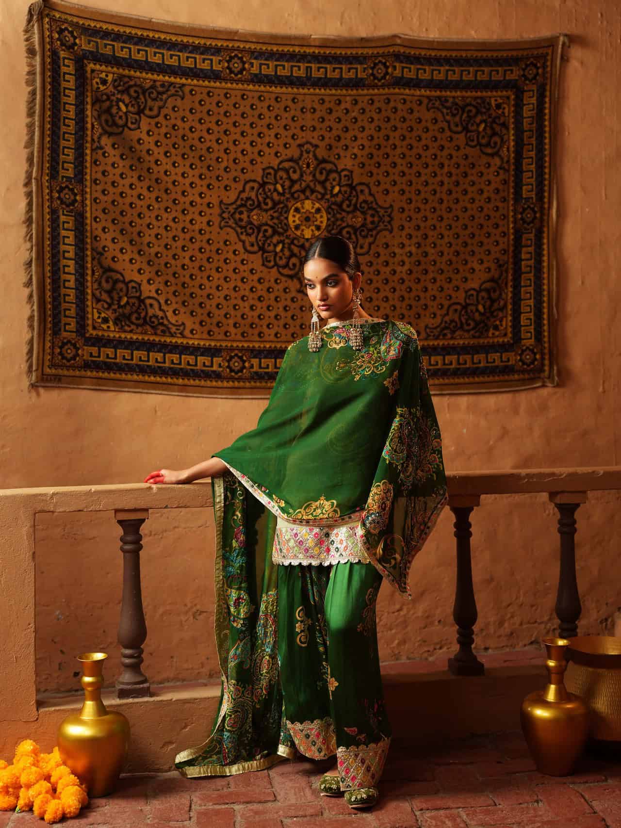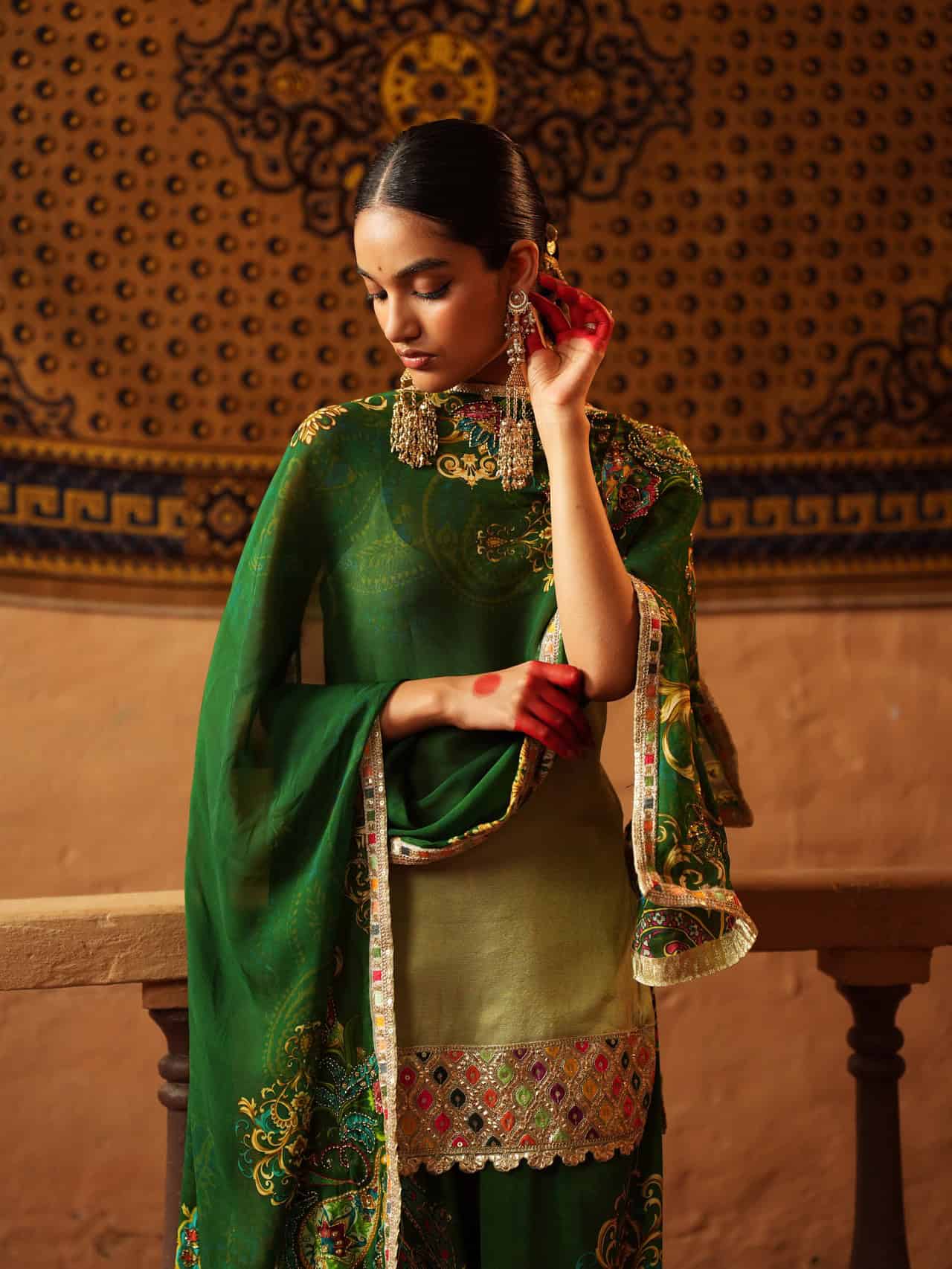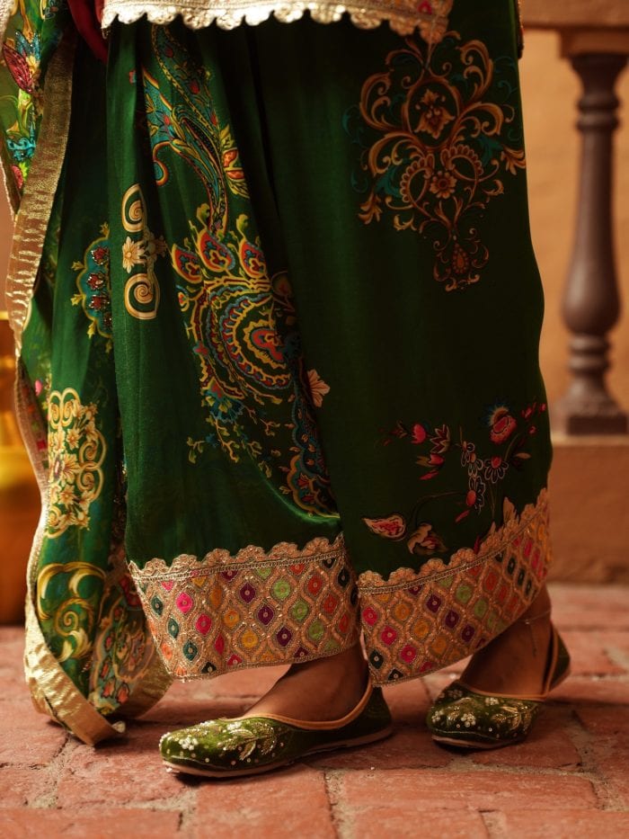 This three-piece ensemble includes a sleeveless mint green kurta with floral embroidery at the hemline, an emerald green dupatta with paisley prints and golden borders, and palazzo pants with matching embroidery.