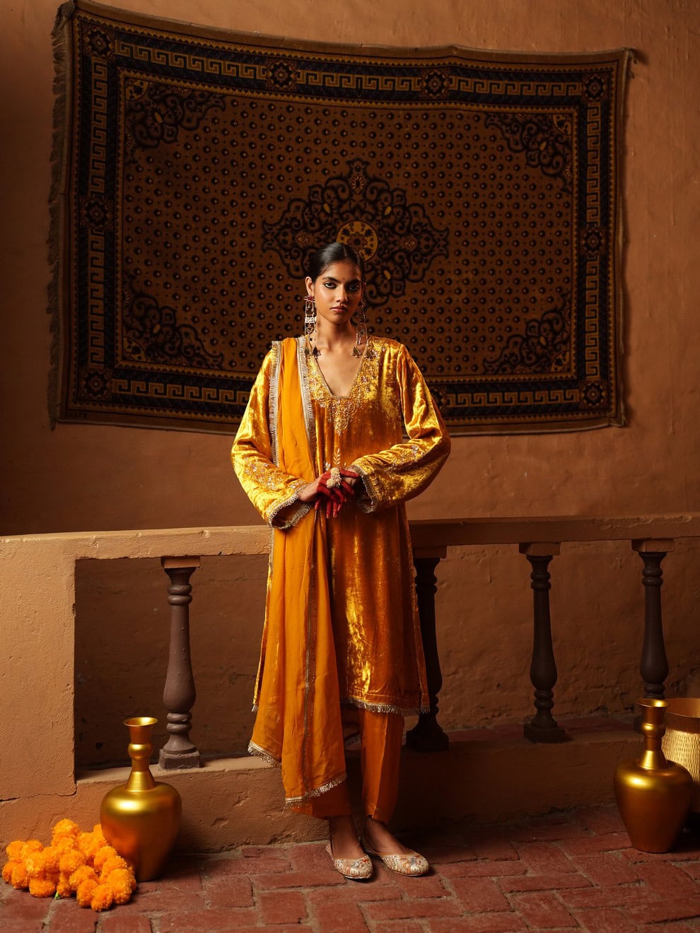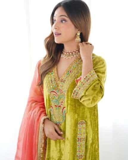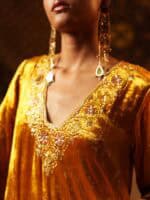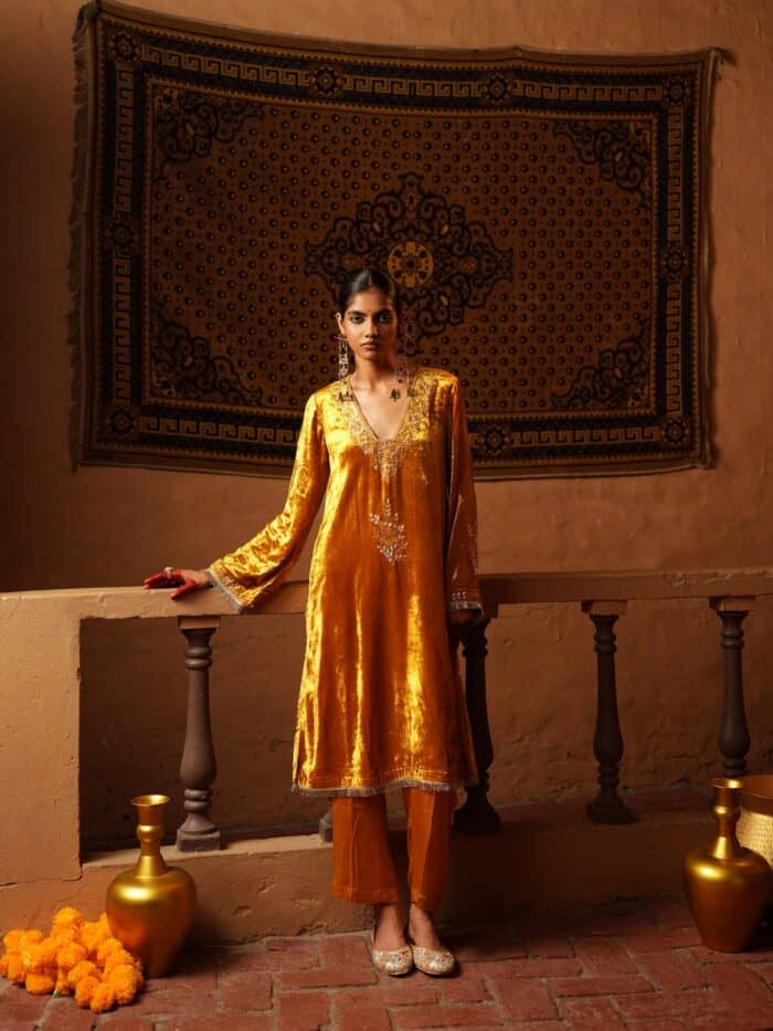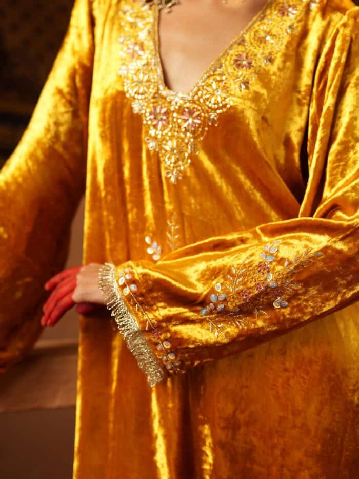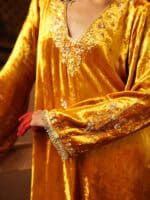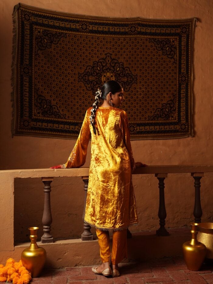 Crafted in rich velvet, this mustard gold suit radiates warmth and elegance. The kurta features delicate hand embroidery along the neckline and sleeves, paired with matching pants and a coordinating dupatta. Perfect for festive evenings and winter celebrations.